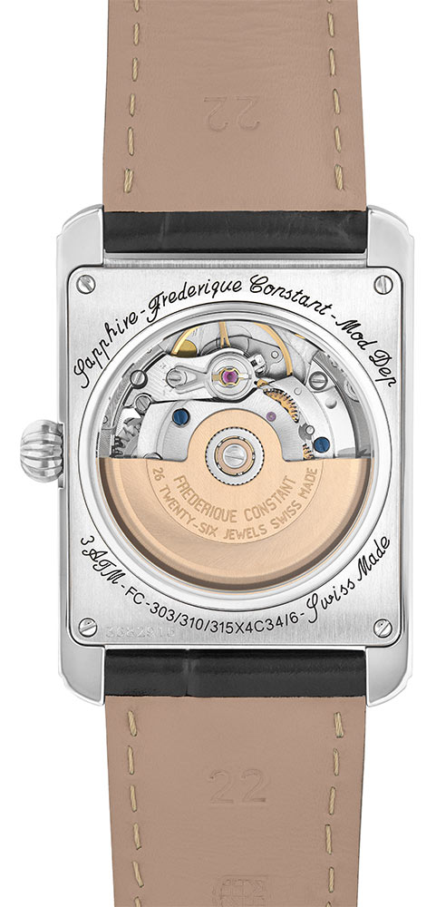 Nowy Classics Carrée Automatic jest zaoferowany w trzech wersjach szwajcarskiego zegarka automatycznego, reprezentujących jego różne wykończenie. Każda została wyposażona w kaliber FC-303, który zapewnia 38 godzin rezerwy mocy oraz ekspozycję swej pracy i budowy przez dekiel ze szkła szafirowego. Najprostszy i najbardziej klasyczny model o numerze referencyjnym FC-303N4C26, który ma stalową kopertę, srebrną tarczę oraz czarny pasek z naturalnej skóry, przedstawiony został powyżej. Najnowocześniejszy model odznacza niebieska tarcza i dopasowany pasek w tym samym odcieniu z niebieskimi przeszyciami Najcenniejszy wariant występuje z kopertą, wskazówkami i indeksami w kolorze różowego złota oraz brązowym paskiem.