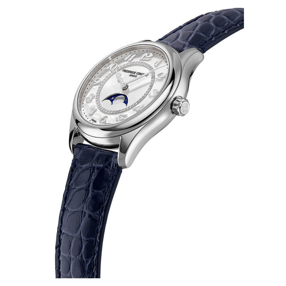 Damski zegarek automatyczny Frederique Constant Classics Elegance Ladies FC-331MPWD3B6 Moon Phase to prawdziwe dzieło sztuki, które rozbrzmiewa precyzją i unikalnym designem. Jego 36-milimetrowa koperta, zawieszona na pasku z egzotycznej skóry w intensywnym odcieniu niebieskiego, od pierwszego spojrzenia przykuwa uwagę. Frederique Constant to więcej niż zegarek – to manifestacja luksusu w najczystszej postaci, która doskonale współgra z każdą elegancką i stylową kreacją, dodając jej niezaprzeczalnego uroku i wyjątkowości.