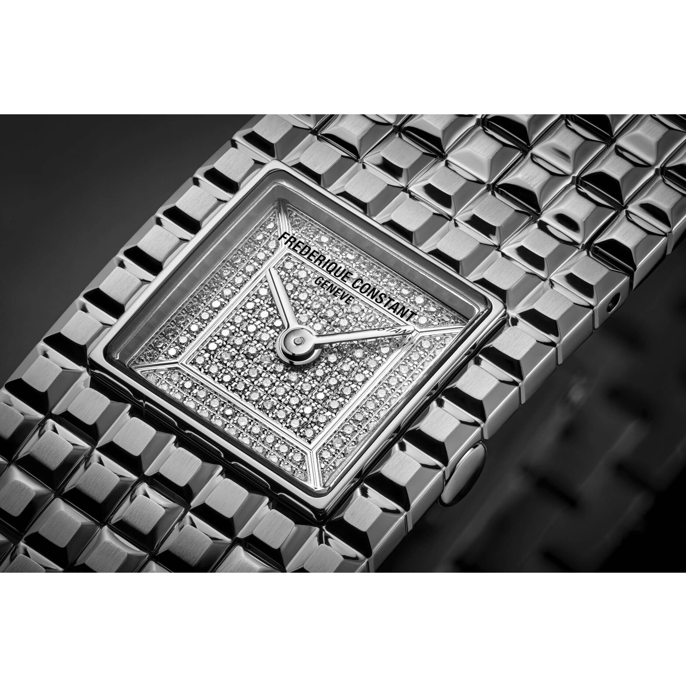 Bransoleta w formie mankietu została zbudowana z siedmiu ogniw i zamknięta w niewidocznym, zintegrowanym zapięciu, które nie zaburza rytmu konstrukcji. Całość pokryto geometrycznym wzorem Clous de Paris – regularnym, ale nie monotonnym, eleganckim, ale nie zachowawczym. Prawdziwe bogactwo, które budzi zachwyt to tarcza ze starannie ułożonymi diamentami w ilości 158 sztuk o łącznej masie 0.28 ct, z której wyrastają klasyczne wskazówki. Koperta w rozmiarze 25.7 mm x 20 mm wykonana ze stali nierdzewnej łączy biżuteryjną lekkość z ponadczasową trwałością, a szwajcarski mechanizm kwarcowy dba o to, by ten stylowy dodatek działał równie precyzyjnie, co wyglądał.
