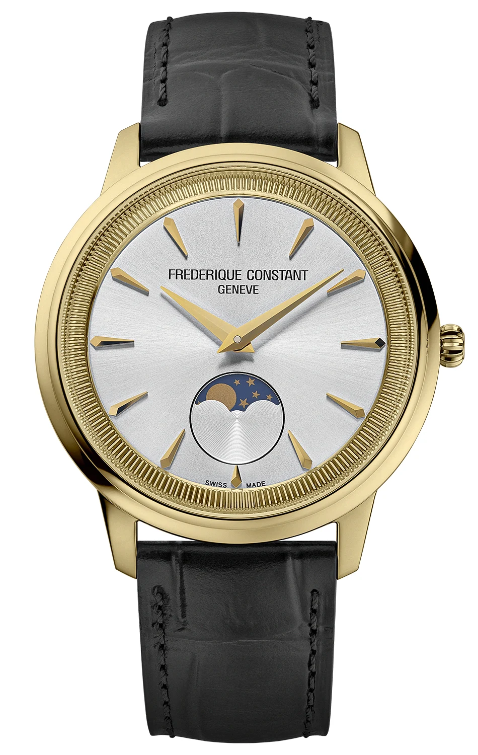 Frederique Constant FC-206S3S5 to klasyczny zegarek z kopertą w kolorze żółtego złota PVD i czarnym paskiem skórzanym. Tarcza ze szlifem słonecznym prezentuje fazy księżyca, a mechanizm kwarcowy zapewnia precyzję na co dzień.