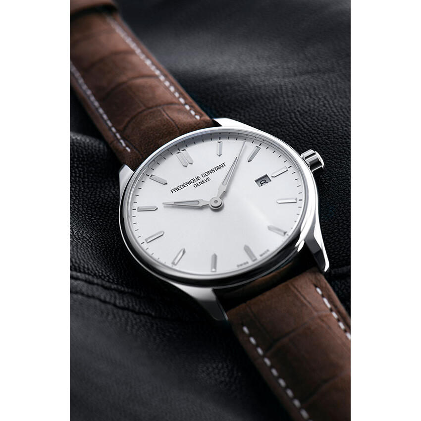 Frederique Constant Classics Quartz FC-220SS5B6 - esencja czasu. Dzięki modelowi Classics Quartz Frederique Constant potwierdza swoją wizję ponadczasowych, niedrogich i pięknie wykończonych zegarków. W 40-milimetrowej stalowej kopercie z tarczą w kolorze srebrnym, super elegancka i dyskretna estetyka skupia uwagę na istocie pomiaru czasu: dwie wskazówki wskazujące godziny i minuty wraz z okienkiem daty. Wobec braku sekundowych wskazówek nic nie odróżnia estetycznie tego Classics Quartz od modelu mechanicznego. Rzeczywiście, są bardziej subtelne podobieństwa, dzięki wysokiemu poziomowi wykończenia: szczotkowana tarcza ze wzorem słonecznym, polerowana koperta, naniesione znaczniki godzin i wyszywany skórzany pasek nubukowy.