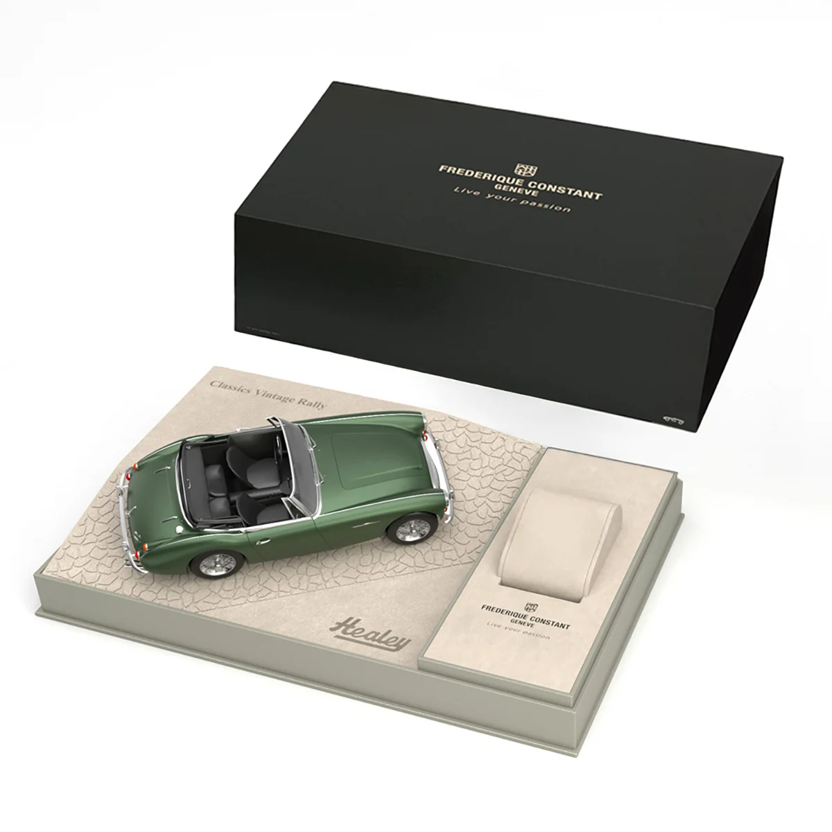 We wnętrzu zegarka pracuje automatyczny kaliber FC-397, który napędza wskazówki godzinowe oraz chronograf — oferuje on 62-godzinną rezerwą chodu. Szwajcarski werk, który pulsuje z częstotliwością 4 Hz to serce, które nie tylko mierzy czas z precyzją, ale także bije w rytmie klasycznych rajdów. Zegarek Frederique Constant Rally Healey Limited Edition FC-397HLBN5B6 na pasku skórzanym oferowany jest w ekskluzywnym zestawie z miniaturowym modelem samochodu Healey 100S – ukłonem w stronę kolekcjonerów, którzy potrafią docenić emocje ukryte w detalach.