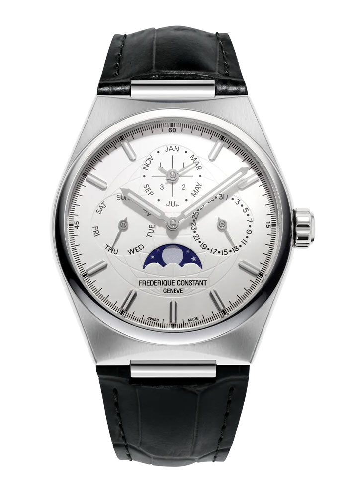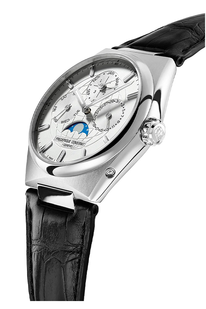 Prezentowany model FC-775S4NH6 posiada oryginalną, rozbudowaną tarczę w jasnym kolorze, która odzwierciedla, jak wielką wagę szwajcarski producent przykłada do kwestii projektowania. Od początku istnienia marki sekcja ta znaczyła bardzo wiele, gdyż, to ona w dużej mierze odzwierciedla przekaz twórców, określa indywidualny charakter oraz nadaje niepowtarzalnej wartości pojedynczemu produktowi. Projekt generalny jest zatem kluczowy, ale i detale nie pozostają bez znaczenia. One stanowią duszę zegarka, kreślą jej kształt, siłę przekazu oraz powołanie. Cyferblat modelu Frederique Constant FC-775S4NH6 Highlife Perpetual Calendar Manufacture w istocie zawiera ważną wiadomość. Trzy subtarcze, będące wskaźnikami dnia miesiąca, jego nazwy oraz dnia tygodnia, wycięte miejsce z funkcją faz księżyca oraz intrygujące tło o postaci siatki globu osadzonej na jasnej sferze... Wszystkie komponenty łączą się w jedność i ilustrują niezwykły sens oraz rolę, jaką odgrywa czas na Ziemi, a także poza nią. Co więcej, czasomierz wyposażono w funkcję wiecznego kalendarza, która od teraz sprawi, że użytkownik może zapomnieć o konieczności regulacji daty w przypadku ilości dni miesiąca z rozróżnieniem 30 i 31 dni oraz lat przestępnych.