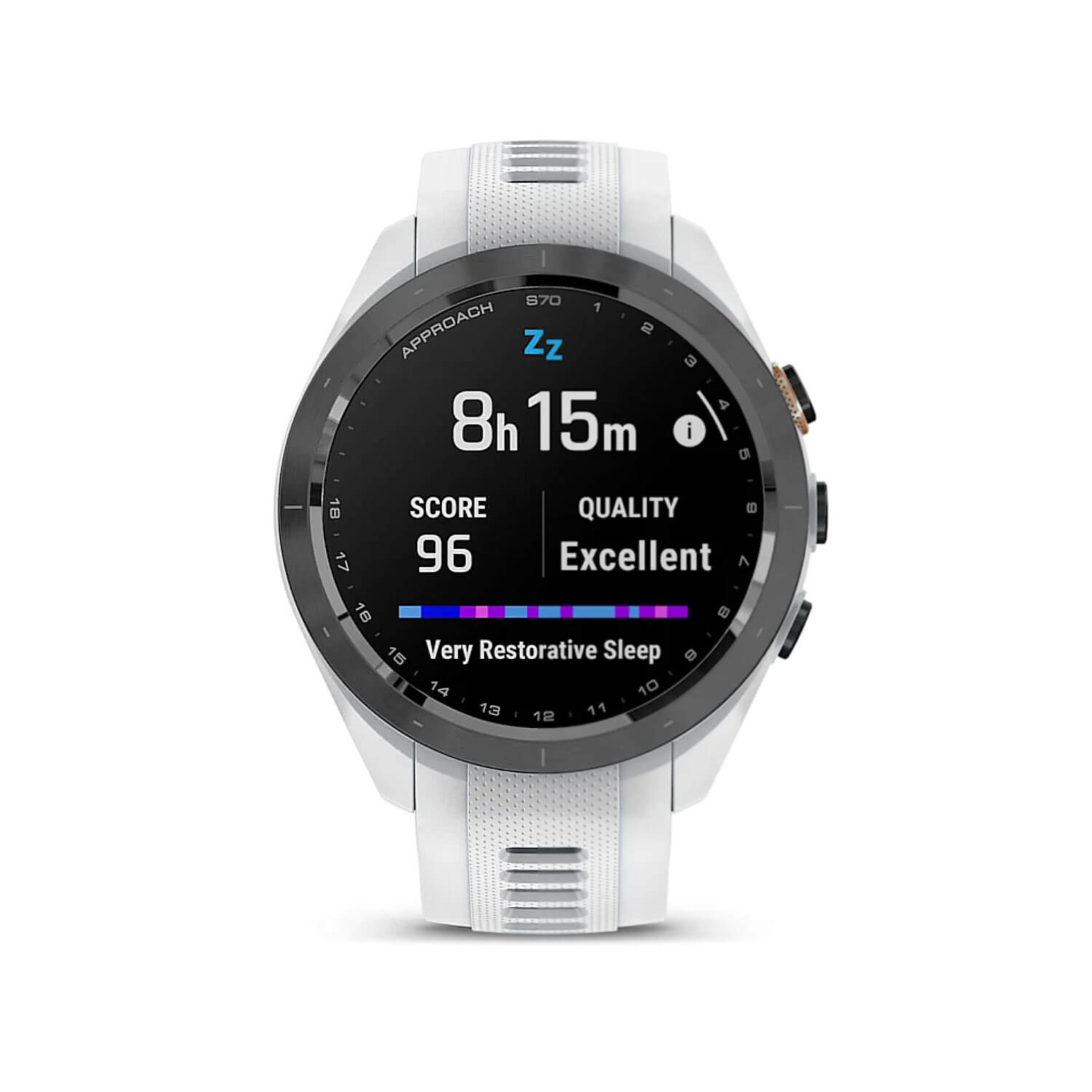 Smartwatch Garmin S70 nie kończy się na golfie. To pełnoprawny zegarek multisportowy, który śledzi tętno, pułap tlenowy, stres, sen, energię Body Battery i jakość oddechu. Możesz odbierać powiadomienia ze smartfona, słuchać muzyki offline z serwisów Spotify, Amazon Music lub Deezer oraz płacić bezdotykowo z pomocą Garmin Pay. Bateria oferuje do 10 dni pracy w trybie smartwatcha i do 15 godzin z aktywnym GPS – co wystarczy nawet na kilkudniowy turniej bez ładowarki.