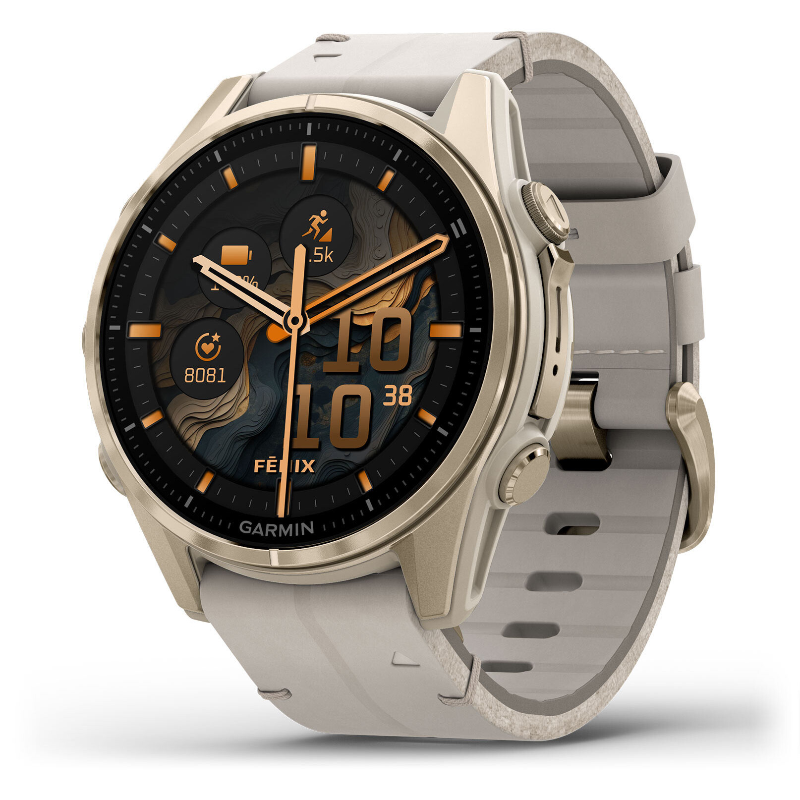 Garmin Fenix 8 wyróżnia się niezwykle czytelnym, dotykowym ekranem AMOLED o przekątnej 1,3 cala, który pozostaje jasny i klarowny nawet w pełnym słońcu. Wyświetlacz zabezpieczony jest odpornym na zarysowania szafirowym szkłem Power Sapphire™. Kompaktowa, 43-milimetrowa koperta zegarka wykonana jest z lekkiego polimeru, a jej front zdobi elegancki pierścień z pozłacanej stali. Wbudowana, wydajna bateria pozwala na nawet 10 dni pracy w trybie smartwatcha oraz do 28 godzin ciągłego użytkowania GPS. Dzięki temu możesz korzystać z zegarka przez ponad tydzień bez codziennego ładowania – na szlaku, podczas podróży służbowej czy treningu na siłowni.
