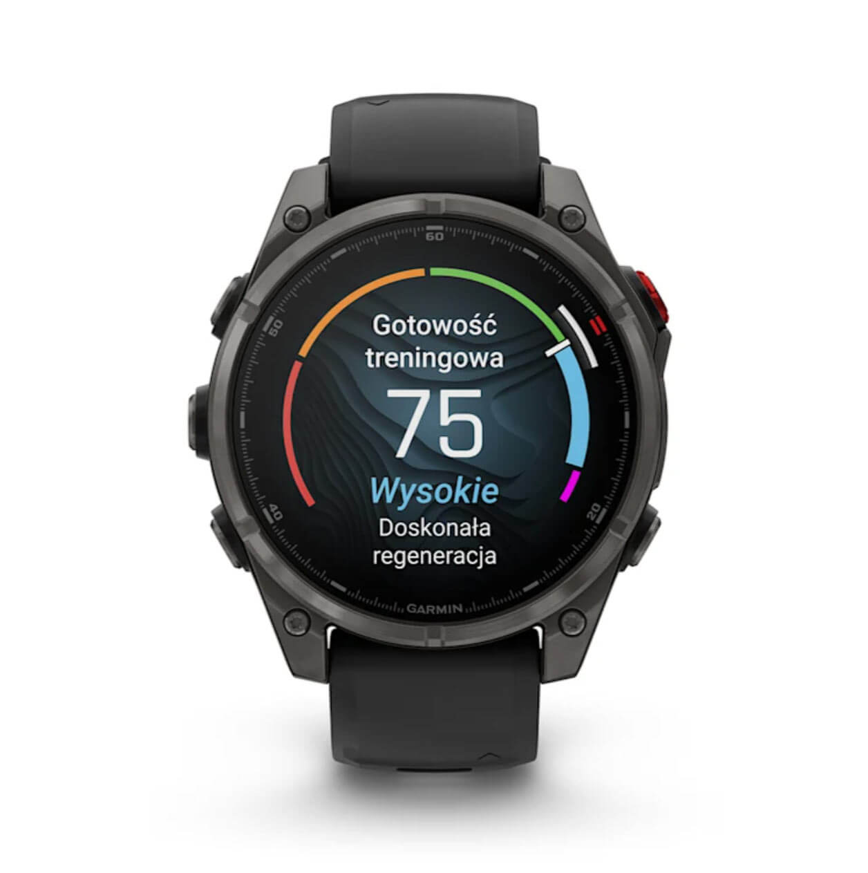 Dotykowy ekran AMOLED o przekątnej 1,4″ oferuje żywe kolory, bardzo wysoką jasność i czytelność. Pokrycie szkłem Power Sapphire™ zapewnia odporność na zarysowania, a tytanowy bezel z czarną powłoką DLC oraz metalowa osłona czujnika gwarantują trwałość w terenie. Smartwatch działa do 15 dni w trybie zegarka i do 44 godzin z GPS, co pozwala na długie wyprawy bez ładowania – idealny towarzysz przygód i treningu.
