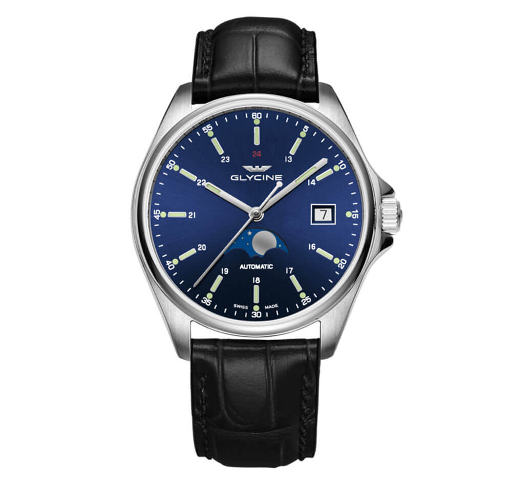 Zegarek Glycine łączy klasykę z techniczną finezją. Niebieska tarcza z fazami Księżyca i datownikiem pod szafirowym szkłem z potrójną powłoką antyrefleksyjną tworzy elegancki, a zarazem praktyczny układ. Automatyczny mechanizm Sellita SW280 widoczny przez przeszklony dekiel potwierdza szwajcarską precyzję, z której marka Glycine słynie od ponad wieku.