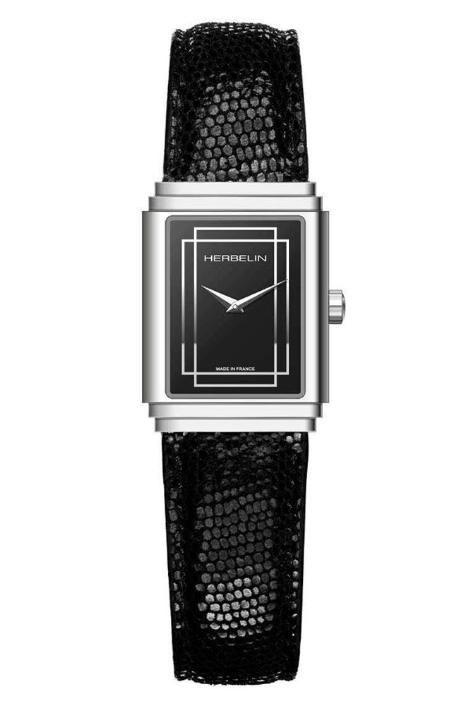 Kolekcja eleganckich modeli Art Deco 1925 s to niezwykle schludna propozycja czasomierzy prostokątnych. Nowe czasomierze Art Deco 1925 s inspirowane są pierwszymi zegarkami produkowanymi przez rodzinną markę Herbelin. Art Deco 1925 s to klasyczny design, który zwraca na siebie uwagę dzięki eleganckiemu wykończeniu. Prostokątna koperta wykonana ze stali szlachetnej o wymiarze 22 mm x 29.5 mm połączona została z eleganckim paskiem skórzanym. Szkło szafirowe niezwykle twarde i trudne do zarysowania chroni ciemną tarczę z masy perłowej. Na tarczy znajdziemy ostre stalowe wskazówki, ozdobne ramki oraz logo marki Herbelin. Tarcza jest urokliwa i bardzo minimalistyczna.