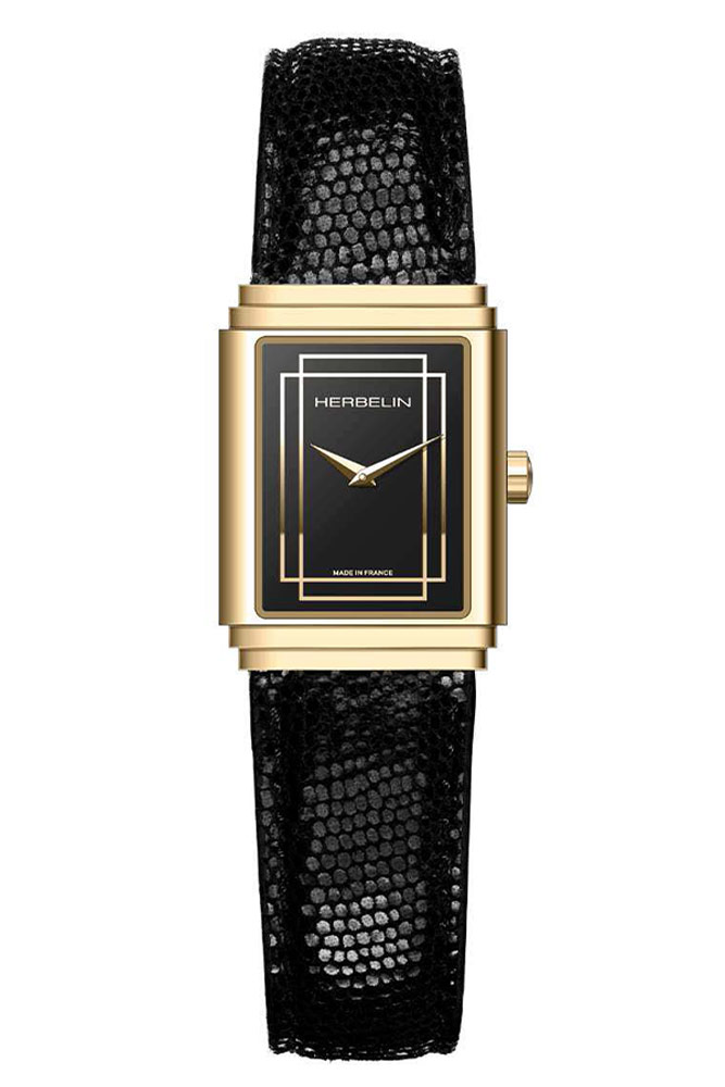 Kolekcja eleganckich modeli Art Deco 1925 s to niezwykle schludna propozycja czasomierzy prostokątnych. Nowe czasomierze Art Deco 1925 s inspirowane są pierwszymi zegarkami produkowanymi przez rodzinną markę Herbelin. Art Deco 1925 s to klasyczny design, który zwraca na siebie uwagę dzięki eleganckiemu wykończeniu. Prostokątna koperta wykonana ze stali szlachetnej ze złotą powłoką PVD o wymiarze 22 mm x 29.5 mm. Obudowa połączona została z eleganckim paskiem skórzanym egzotycznym. Szkło szafirowe niezwykle twarde i trudne do zarysowania chroni ciemną tarczę z masy perłowej. Na tarczy znajdziemy ostre stalowe złocone wskazówki jak i ozdobne ramki oraz logo marki Herbelin. Tarcza jest urokliwa i bardzo minimalistyczna.