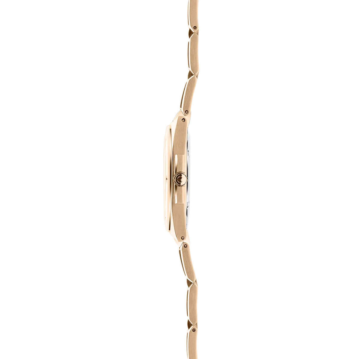 Elegancka, okrągła koperta zegarka wykonana z wysokiej jakości stali szlachetnej ma średnicę 33 mm w kolorze różowo-złotym PVD, co nadaje jej subtelną, a zarazem wyrafinowaną formę. Sześć ozdobnych śrub na bezelu dodaje modelowi luksusowego charakteru, podkreślając jego wyrafinowany wygląd. Idealnie dopasowana do obudowy pozłacana bransoleta zapewnia nie tylko trwałość, ale również wygodę noszenia, dzięki zapięciu motylkowemu, które gwarantuje bezpieczne i komfortowe użytkowanie. Ten model to doskonały wybór dla Pań szukających zegarka, który łączy codzienną funkcjonalność z elegancją. Wyjątkowy efekt wizualny uzyskany poprzez połączenie polerowanych i szczotkowanych powierzchni koperty oraz bransolety przypomina subtelną grę światła i cienia, nawiązując do odbić księżyca na spokojnej wodzie, podkreślając naturalny blask stali.