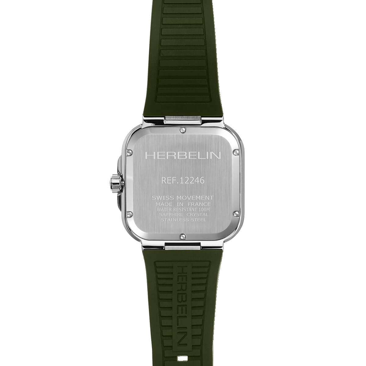 Tarcza tego modelu, wykończona w odcieniach głębokiej zieleni z poziomym tłoczeniem, przypomina spokojne fale Morza Śródziemnego. Indeksy oraz wskazówki pokryto warstwą luminescencyjną, co zapewnia czytelność po zmroku, a datownik na godzinie szóstej uzupełnia kompozycję o praktyczny detal. Wewnątrz pracuje szwajcarski mechanizm kwarcowy Ronda, który – choć niewidoczny – stanowi fundament precyzyjnego działania całego zegarka. Kwadratowy zegarek Herbelin 12246A116CK na gumowym pasku to nowoczesny czasomierz z duszą – zaprojektowany z myślą o codziennej niezawodności, ale i z wyczuciem stylu, który nie przemija.