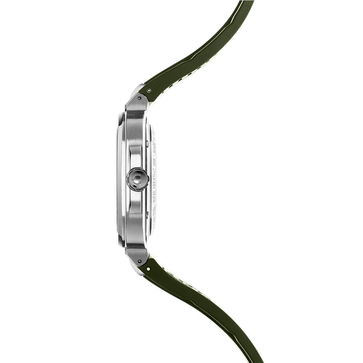Stalowa koperta o wymiarach 40.5 × 40.5 mm to kwintesencja męskiej symetrii – proporcjonalna, wyrazista, wykończona szczotkowaniem, które podkreśla solidność i nowoczesny charakter formy. Cztery śruby na froncie bezelu przypominają o technicznej precyzji, a koronka na godzinie trzeciej została zaprojektowana z myślą o wygodzie obsługi. Zintegrowany z kopertą zielonym pasek z gumy FKM nie tylko harmonizuje z kolorystyką tarczy, ale też gwarantuje odporność na wilgoć, temperaturę i intensywne użytkowanie. Szafirowe szkło zapewnia perfekcyjną przejrzystość i długotrwałą ochronę – zarówno przed codziennymi zarysowaniami, jak i upływem czasu.
