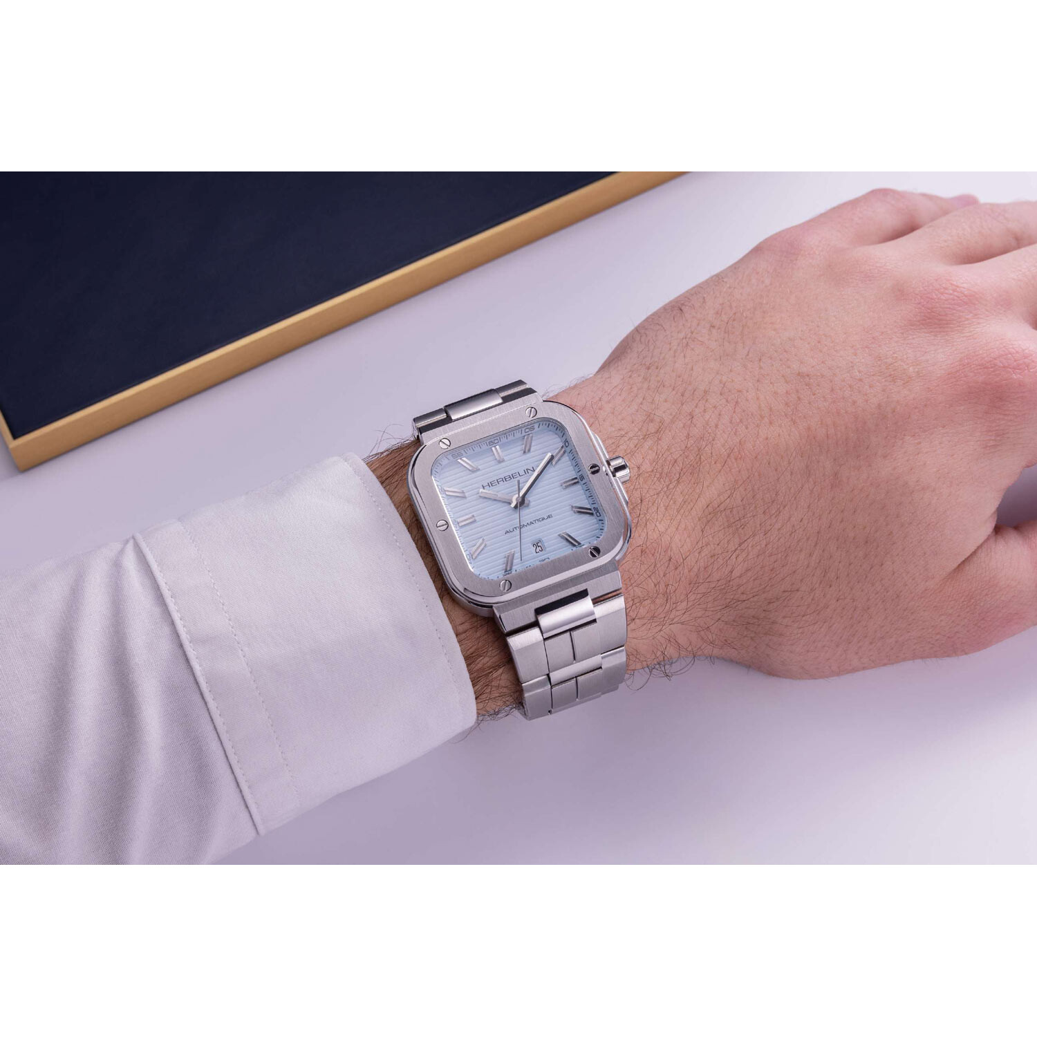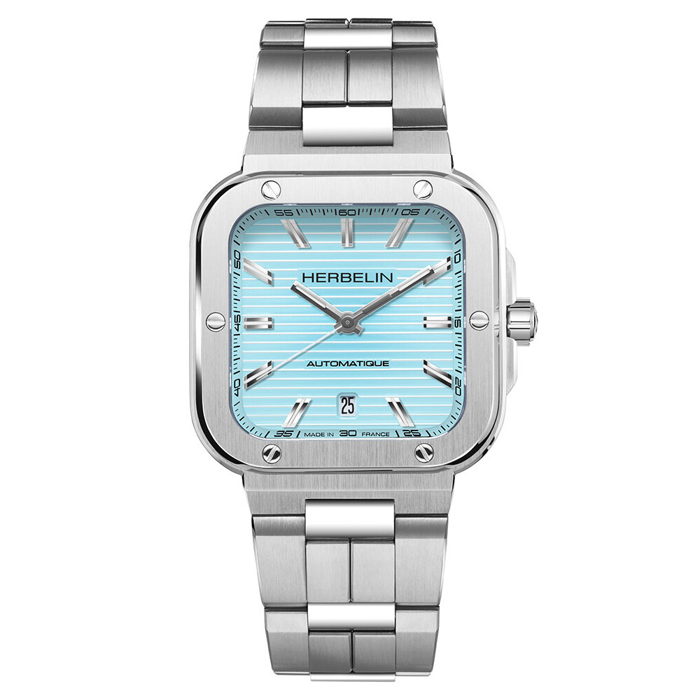 Kwadratowy zegarek Herbelin od frontu zabezpieczony został wysoce odpornym na zarysowania szkłem szafirowym. Osłania ono kwadratową, jasnoniebieską tarczę z ozdobą w postaci poziomych pasów. Aktualną godzinę wskazują duże, stalowe wskazówki i indeksy liniowe. Producent zadbał o łatwe odczytanie godziny w gorszych warunkach oświetleniowych. Na wskazówkach i indeksach nałożona została świecąca masa luminescencyjna. Godzina szósta zarezerwowana została dla okna datownika. Okno z jasnym tłem wskazuje aktualny dzień miesiąca. Pod tarczą zainstalowany jest szwajcarski werk automatyczny, który napędzany jest ruchem nadgarstka. Sellita SW200 to popularny, sprawdzony i precyzyjny mechanizm, który nie zawiedzie swojego właściciela. Oferuje on rezerwę chodu do około 40 godzin, a jego pracę obserwować można dzięki transparentnemu deklowi na tyle koperty.