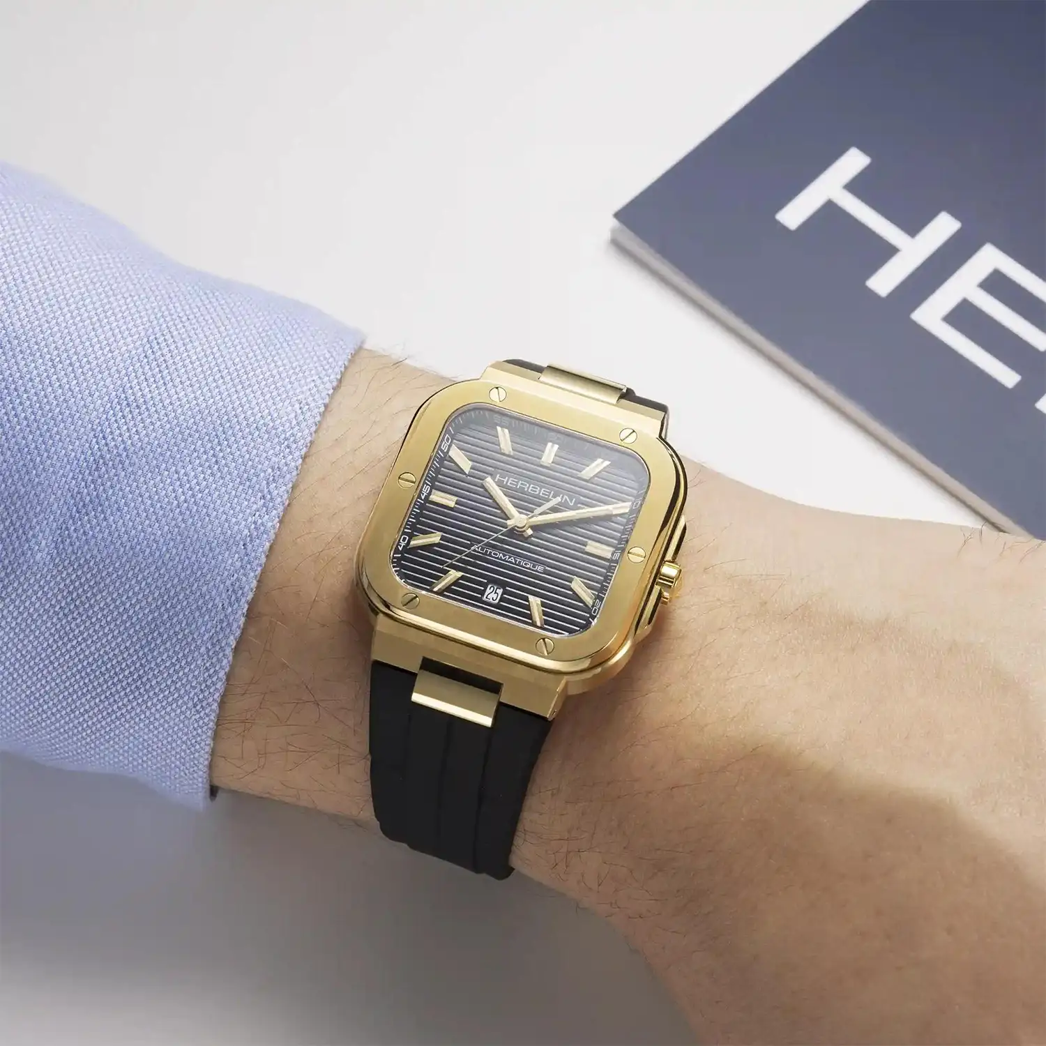Dzięki ponad 60-letniemu doświadczeniu w budowaniu czasomierzy francuska marka zegarmistrzowska Herbelin z dumą może przedstawić dzieło, które łączy tradycję, design i najwyższą jakość. Pozłacany zegarek męski Herbelin 1646P1N14CA z kolekcji Cap Camarat Square Automatic to niecodzienny projekt, który zwróci na siebie uwagę wszystkich fanów unikatowej sztuki ze świata zegarmistrzostwa. Prezentowany męski model to idealne połączenie francuskiego luksusu z ponadczasowym stylem.