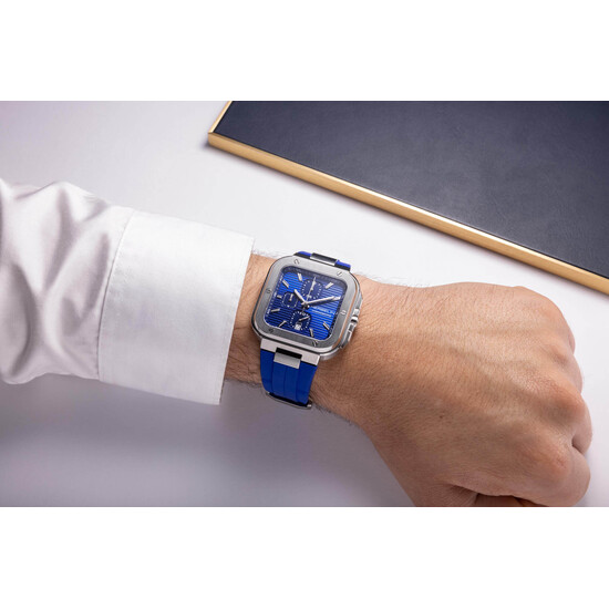 Obudowa o wymiarach 40.5 × 40.5 mm została wykonana z odpornej na korozję stali szlachetnej 316L i uzupełniona o przyciski stopera oraz wygodną koronkę z boku koperty. Szafirowe szkło chroni tarczę przed zarysowaniami, a głęboko tłoczony wzór podkreśla trójwymiarowość kompozycji. Niebieski pasek z gumy FKM – materiału wyjątkowo odpornego na wilgoć i działanie czasu – sprawia, że zegarek równie dobrze odnajdzie się na jachcie, jak i w miejskim stylu smart casual. To nie tylko projekt z charakterem, ale też konstrukcja gotowa na codzienne wyzwania – z gwarancją niezawodności i komfortu.