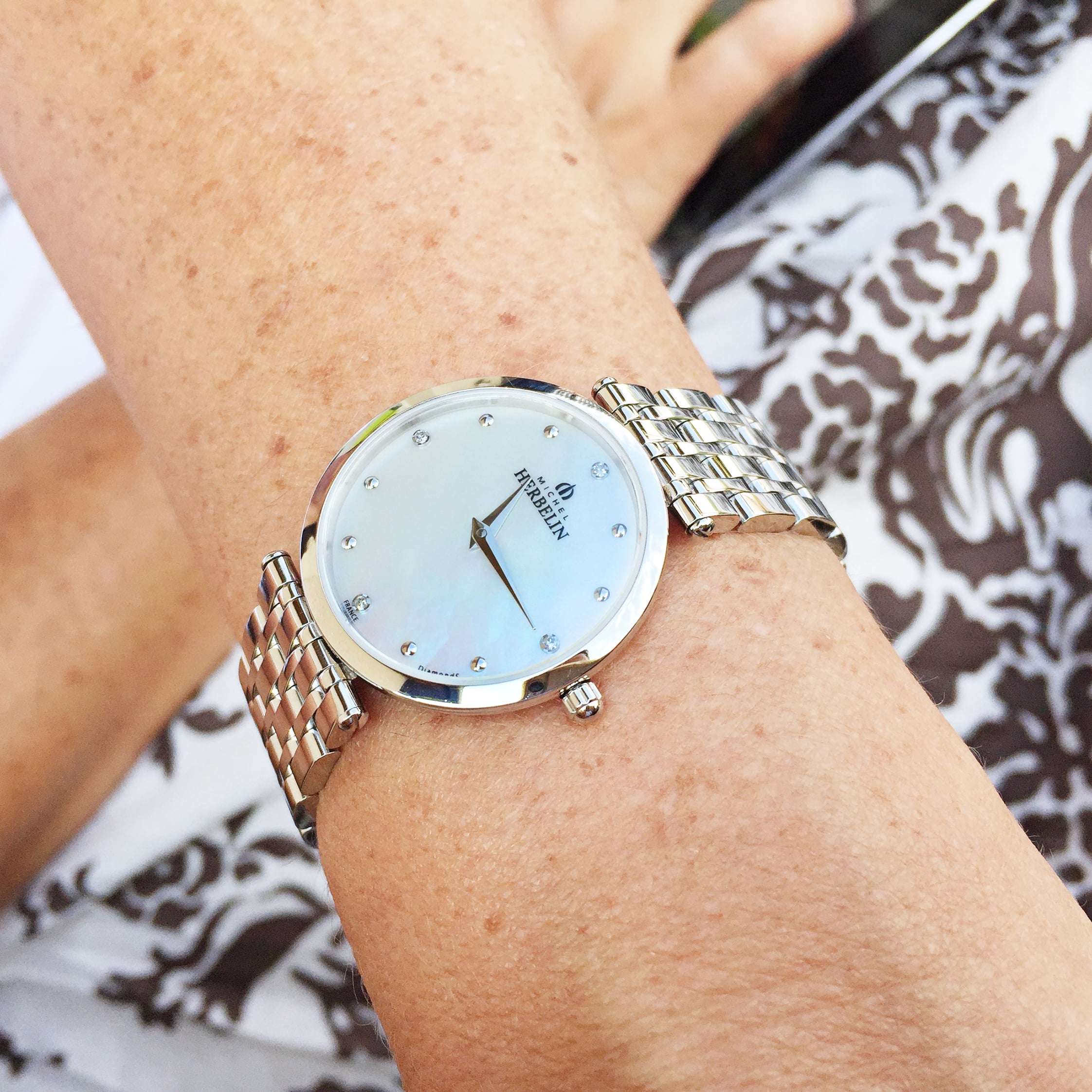 Klasyczny zegarek damski prosto z Francji Herbelin z kolekcji Epsilon 17116/B89. Prezentowany model to okrągły czasomierz wykonany ze stali szlachetnej w połączeniu ze stalową bransoletką. Do cienkiej obudowy przymocowano elegancką bransoletę z zapięciem motylkowym. Pod szkłem szafirowym niezwykle trudnym do zarysowania znajdziemy perłową tarczę z ostrymi wskazówkami oraz przepiękne diamenty na punktach godzinowych. Tarcza jest bardzo czysta, minimalistyczna i nie posiada dodatkowych funkcji, przez co jest bardzo czytelna i dzięki diamentom z przyjemnością odczytuje się z niej aktualną godzinę. Ronda 751 to szwajcarski mechanizm kwarcowy, który jest sercem przedstawionego czasomierza. Zegarek Herbelin 17116/B89 to propozycja cieniutkiego zegarka naręcznego. Koperta oraz bransoleta sprawią, że zegarek użytkować się będzie z ogromnym komfortem. Diamenty na perłowej tarczy z pewnością będą cieszyły oko każdej użytkowniczki. Na zdjęciu promocyjnym można zauważyć, że zegarek przepięknie prezentuje się na nadgarstku.