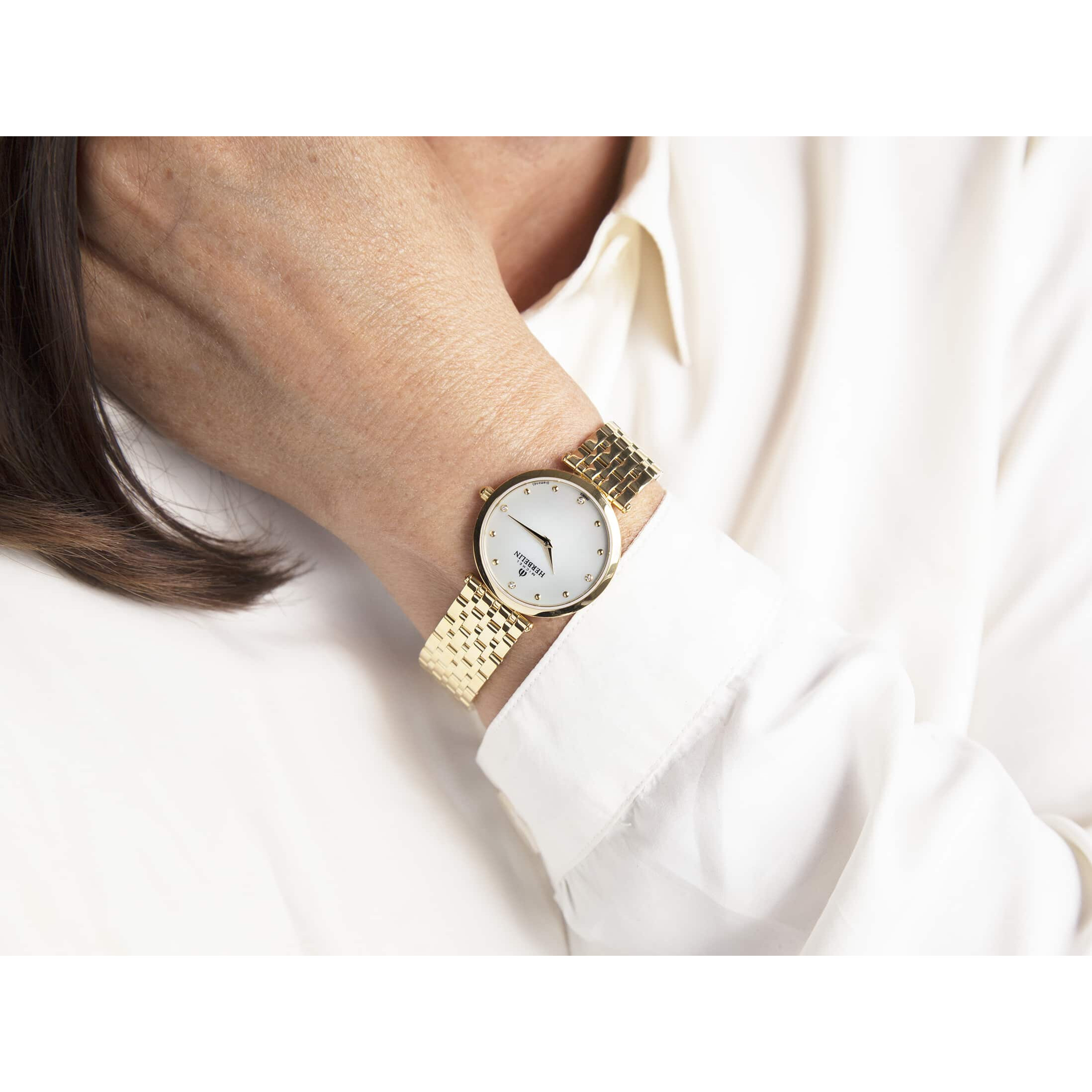 Herbelin Epsilon 17116/B89 jest propozycją pięknego i delikatnego czasomierza dla pań prosto z Francji. Herbelin Epsilon to wykonana ze stali szlachetnej okrągła koperta ze specjalną wzmacniającą złotą powłoką PVD w wymiarach 28 mm oraz bransoletka również w kolorze złotym z zapięciem motylkowym, które zapewni bezpieczne użytkowanie zegarka. Czasomierz jest jednym z mniejszych propozycji zegarków naręcznych, dzięki czemu świetnie zaprezentuje się na drobniejszych nadgarstkach. Cienka koperta w połączeniu z lekką bransoletką zapewni wygodne użytkowanie w każdej sytuacji. Elementem ochronnym tarczy jest szkło szafirowe niezwykle trudne do zarysowania. Szkło szafirowe w zegarku Epsilon 17116/B89 ma ważne zadanie, bowiem chroni piękną perłową tarczę, ale i diamenty osadzone na punktach godzinowych. Pod tarczą zegarka ukryty jest szwajcarski mechanizm kwarcowy Ronda 751 zasilany baterią. Mechanizmy kwarcowe to sprawdzone i skuteczne mechanizmy, które zapewnią prawidłową pracę całego czasomierza. Herbelin Epsilon 17116/B89 to piękny pozłacany zegarek z perłową tarczą i diamentami. Czasomierz z pewnością wyróżni się na każdym kobiecym nadgarstku i świetnie dopasuje się do eleganckiego jak i codziennego outfitu.