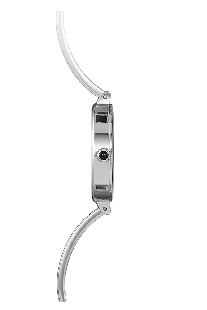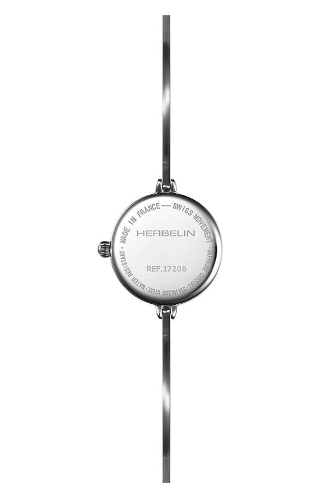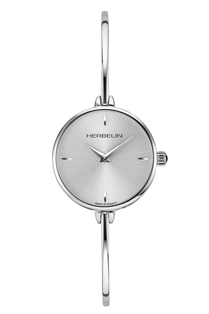 Zegarek Herbelin 17206B11 z nowej kolekcji Fil to propozycja francuskiego czasomierza biżuteryjnego, który wyróżnia się dzięki swojej bransolecie. Koperta wykonana jest ze stali szlachetnej nierdzewnej w kolorze srebrnym. Na odwrocie obudowy znajduje się stalowy dekiel. Do uszu obudowy przymocowana została sztywna biżuteryjna bransoletka. Pod szkłem szafirowym twardym i trudnym do zarysowania znajduje się minimalistyczna srebrna słoneczna tarcza. Na tarczy znajdziemy cztery indeksy liniowe oraz ostre wskazówki. Nie zabrakło również miejsca dla dumnego logo marki Herbelin.