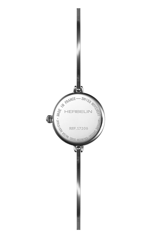 Zegarek Herbelin 17206B14 z nowej kolekcji Fil to propozycja francuskiego czasomierza biżuteryjnego, który wyróżnia się dzięki swojej bransolecie. Koperta wykonana jest ze stali szlachetnej nierdzewnej w kolorze srebrnym. Na odwrocie obudowy znajduje się stalowy dekiel. Do uszu obudowy przymocowana została sztywna biżuteryjna bransoletka. Pod szkłem szafirowym twardym i trudnym do zarysowania znajduje się minimalistyczna czarna słoneczna tarcza. Na tarczy znajdziemy cztery indeksy liniowe oraz ostre wskazówki. Nie zabrakło również miejsca dla dumnego logo marki Herbelin.