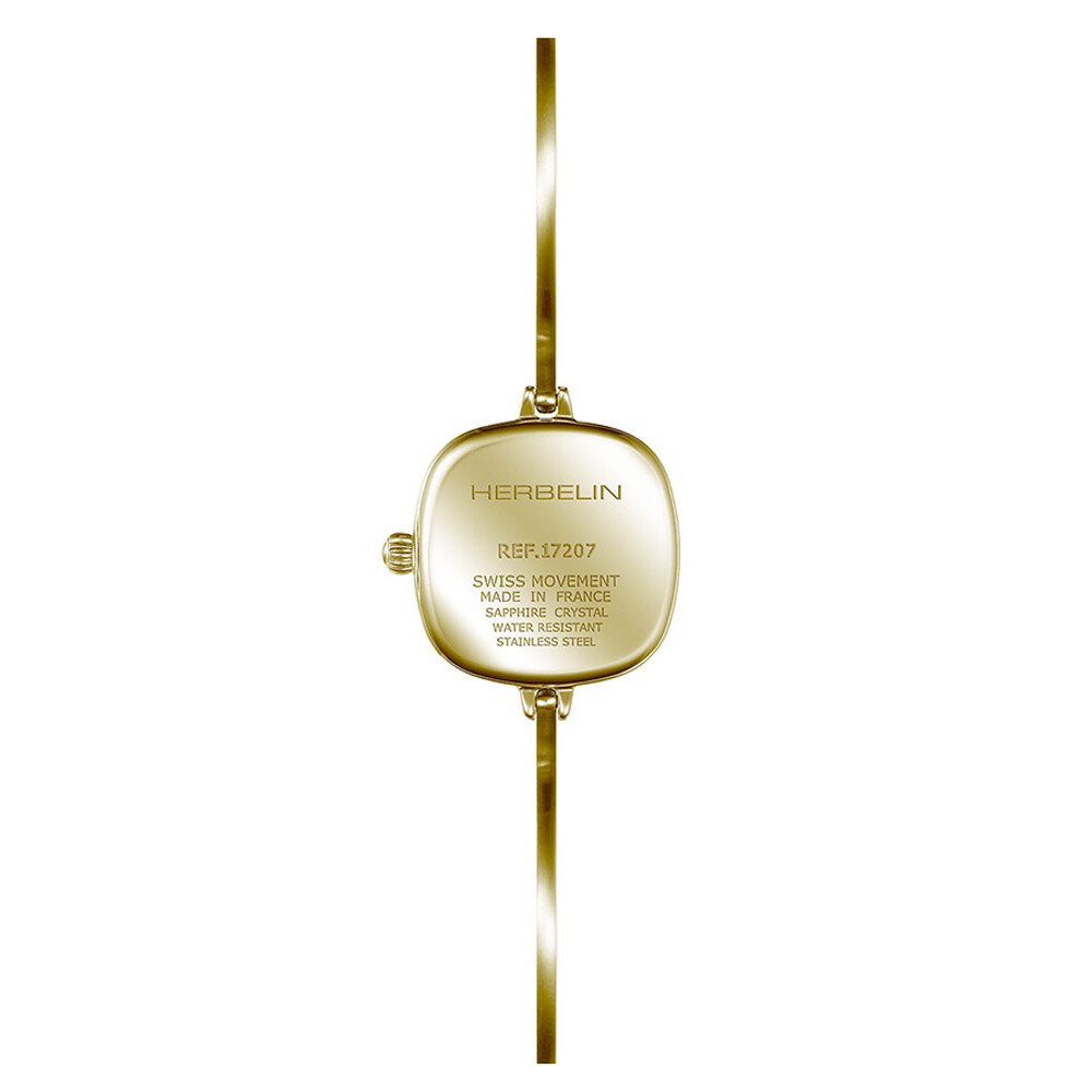 Francuska marka Herbelin przedstawia bardzo kobiecą kolekcję zegarków Fil. Prezentowany model 17207BP11 to czasomierz na lekkiej biżuteryjnej bransoletce. Kwadratowa obudowa z zaokrąglonymi krawędziami wykonana została ze stali nierdzewnej w kolorze złotym z powłoką PVD. Do jej uszu przymocowana została cienka i lekka bransoletka. Jest ona sztywna i również wykonana ze stali o biżuteryjnym designie. Na słonecznej srebrnej tarczy znajdziemy delikatne indeksy liniowe oraz sztyletowe pozłacane wskazówki. Tarcza przykryta została niezawodnym szkłem szafirowym. Na odwrocie obudowy znajduje się stalowy dekielek.