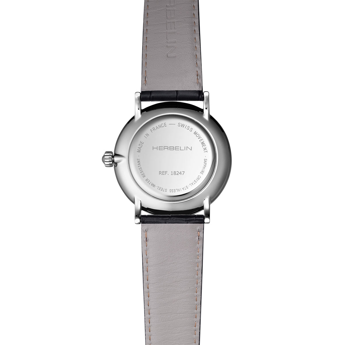 Tarcza w czarnym kolorze zyskuje na elegancji i oryginalności. Pod szkłem szafirowym, odpornym na zarysowania, widoczne są precyzyjnie wykonane indeksy liniowe. Godzinę dwunastą uzupełnia cyfra arabska. Aktualny czas wskazują smukłe wskazówki. Subtarcza umieszczona na godzinie szóstej to sekundnik, który dodaje zegarkowi dynamiki i charakteru retro. Szwajcarski mechanizm kwarcowy Ronda, który napędza ten elegancki czasomierz Herbelin 18247AP14, gwarantuje niezawodność i bardzo dobre odmierzania czasu.