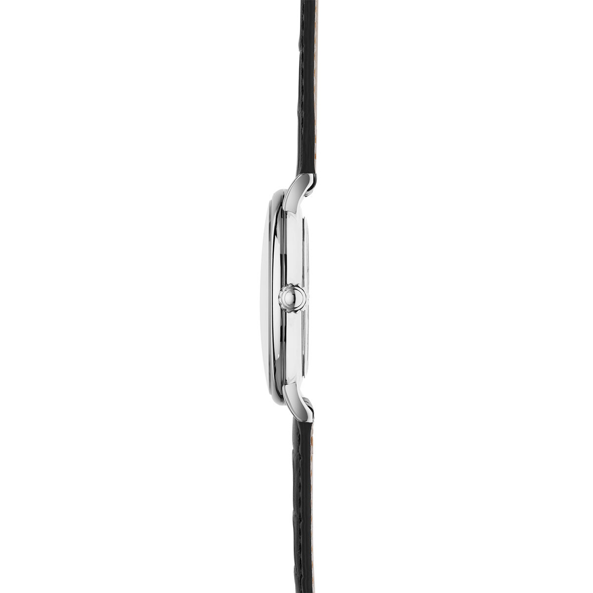 Okrągła stalowa koperta o kompaktowej średnicy 40 mm nadaje temu czasomierzowi solidność i klasycznego wyglądu. Detale dodają mu wyjątkowego charakteru, a jednocześnie podkreślają jego luksusowy styl. Po prawej stronie tradycyjnie na godzinie trzeciej zainstalowana jest wygodna w obsłudze koronka, a rewers to salowy dekiel, który skutecznie zamyka całą konstrukcję. Pasek skórzany w kolorze czarnym z przeszyciem jest nie tylko estetyczny, ale także komfortowy w noszeniu, co sprawia, że czasomierz stanowi idealne dopełnienie męskiej garderoby.