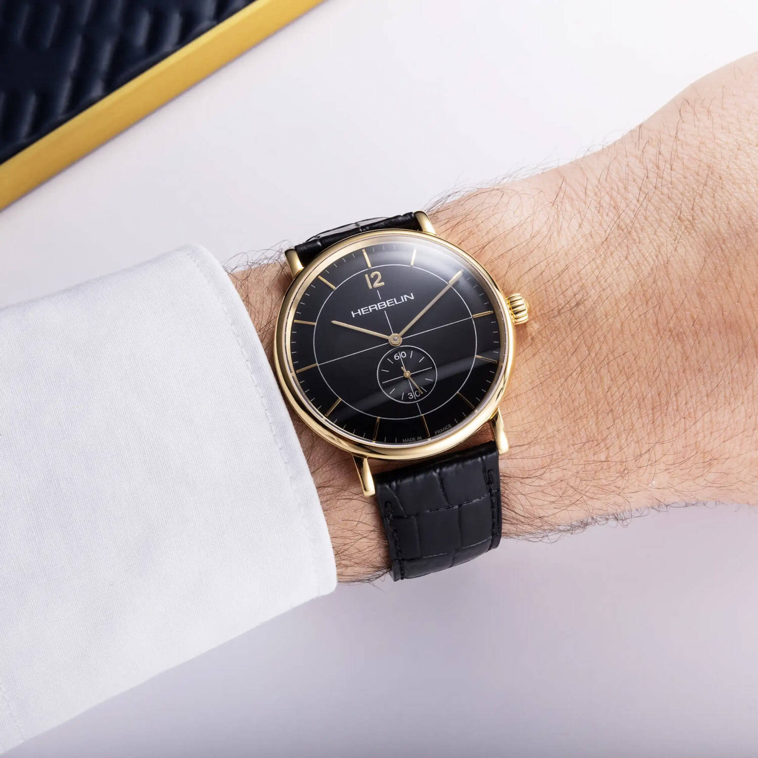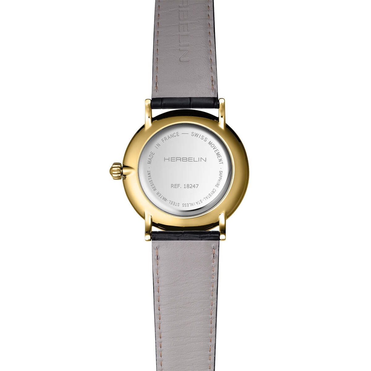 Tarcza w czarnym kolorze zyskuje na elegancji i oryginalności. Pod szkłem szafirowym, odpornym na zarysowania, widoczne są precyzyjnie wykonane indeksy liniowe. Godzinę dwunastą uzupełnia cyfra arabska. Aktualny czas wskazują smukłe wskazówki. Subtarcza umieszczona na godzinie szóstej to sekundnik, który dodaje zegarkowi dynamiki i charakteru retro. Szwajcarski mechanizm kwarcowy Ronda, który napędza ten elegancki czasomierz Herbelin 18247P14, gwarantuje niezawodność i bardzo dobre odmierzania czasu.