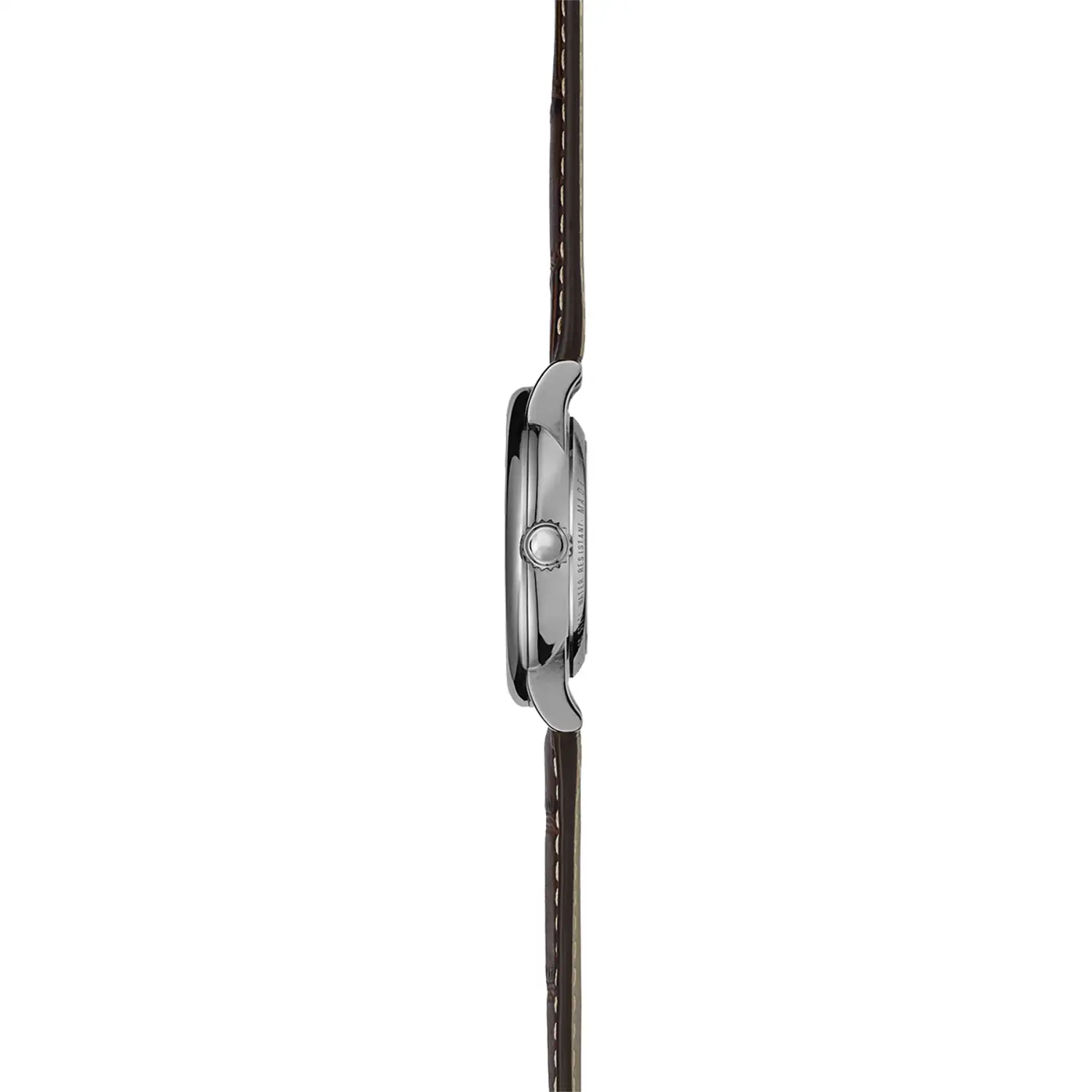 Koperta o uniwersalnej średnicy 38 mm została wykonana z idealnie wypolerowanej stali szlachetnej, tworząc jasną, lśniącą ramę dla ciemnej tarczy. Smukły profil obudowy gwarantuje, że czasomierz doskonale układa się na nadgarstku i swobodnie mieści pod mankietem koszuli, podkreślając nienaganny styl w sposób dyskretny i pełen klasy. Nad bezpieczeństwem tej artystycznej kompozycji czuwa wypukłe szkło szafirowe. Jego wyjątkowa twardość zapewnia ochronę przed zarysowaniami, zachowując przy tym przejrzystość, która pozwala docenić każdy detal cyferblatu przez wiele lat.