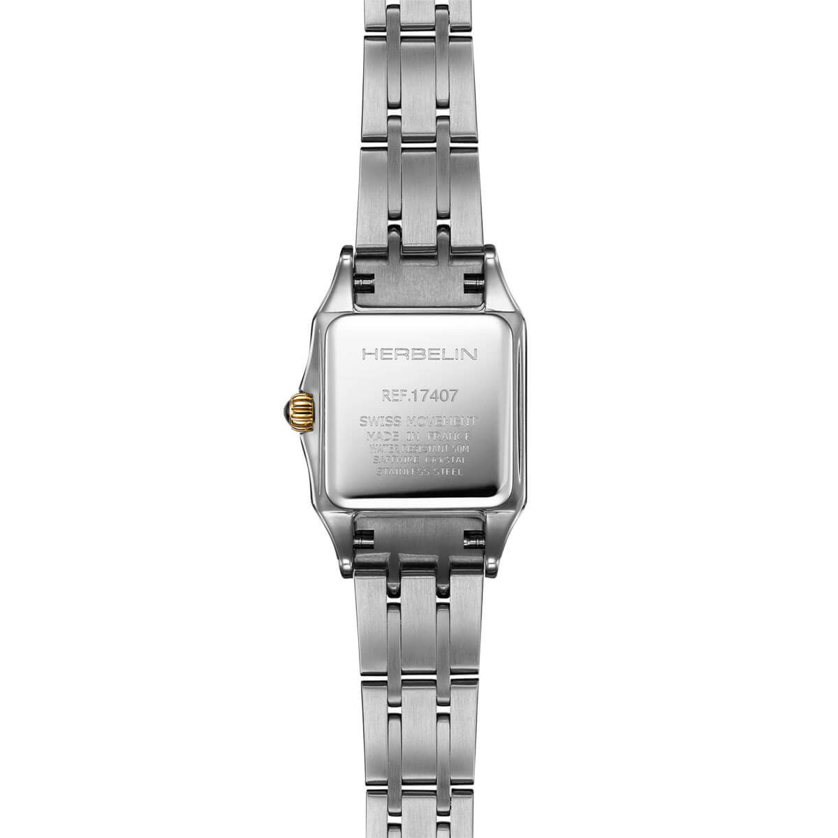 Smukła koperta o wymiarach 18.60 × 20 mm została wykonana z odpornej stali szlachetnej 316L, której eleganckie, satynowane wykończenie podkreśla ponadczasową formę. Zestawiono ją z bransoletą – solidną, ale niezwykle wygodną w czasie noszenia. Model ten posiada pozłacane powłoką PVD elementy. Ramka bezela, koronka oraz środkowe ogniwa bransolety pokryte są złotą powłoką. Szkło szafirowe zabezpiecza cyferblat przed zarysowaniami i sprawia, że zegarek nie traci uroku nawet przy intensywnym użytkowaniu.