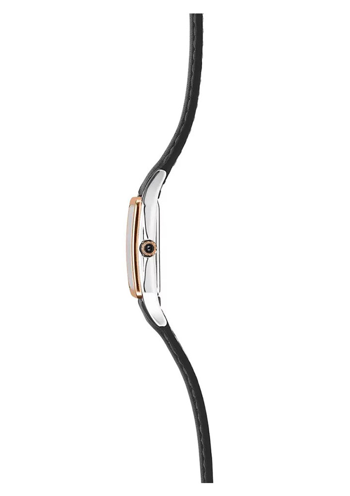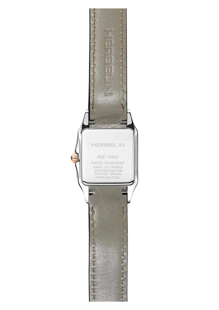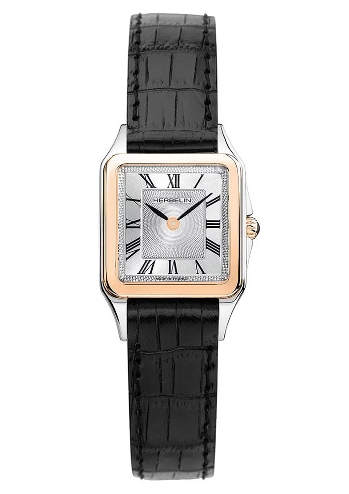 Herbelin Luna 17457TR01 to zegarek kwadratowy w rozmiarze 24 mm x 24 mm. Ten biżuteryjny dwukolorowy zegarek oferowany jest na skórzanym pasku. Wszystkie Panie, które kochają skromny design, polubią się z tym modelem. Zegarek od frontu osłoniony jest twardym i wysoce odpornym na zarysowanie szkłem szafirowym. Pod szkłem znajduje się elegancki cyferblat w kolorze srebrnym guilloché. Środkowa część ozdobiona została giloszem. Aktualną godzinę wskazują eleganckie wskazówki i rzymskie indeksy. Model ten napędza szwajcarski mechanizm Ronda zasilany baterią.