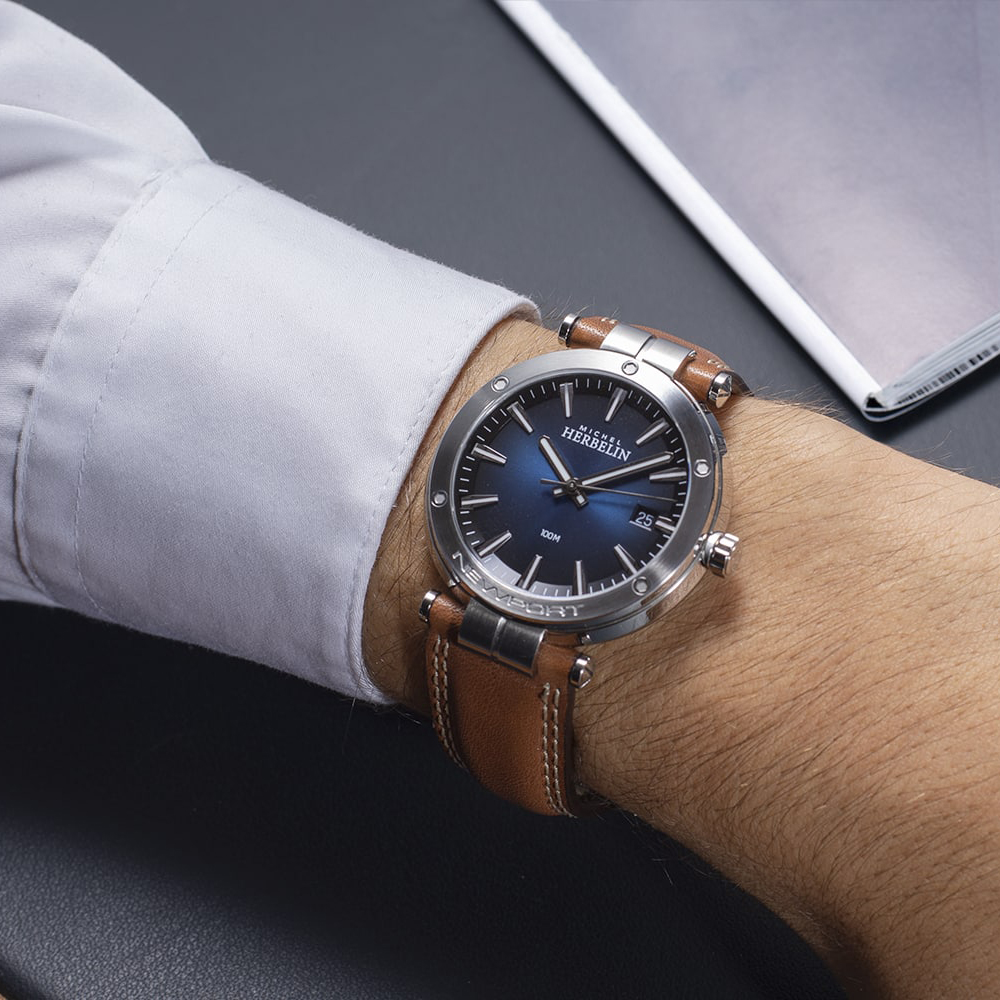 Herbelin marka prosto z Francji przedstawiła elegancki czasomierz z kolekcji Newport wykonany w żeglarskim stylu. Model 12288A15GD to świetny przedstawiciel okrągłego zegarka naręcznego eleganckiego łączonego ze sportowymi akcentami. Okrągła obudowa ze stali szlachetnej jest w kolorze srebrnym. Na bezelu koperty zauważyć można ozdobne śrubki oraz dumną nazwę kolekcji NEWPORT. Na prawej stronie obudowy umieszczono koronkę do kontrolowania zegarka. Do uszu obudowy przymocowany został elegancki pasek ze skóry naturalnej w kolorze brązowym. Brązowy pasek to klasyczny kolor, dzięki któremu z łatwością zegarek zgra się z paskiem od spodni lub eleganckimi butami. Pod szkłem szafirowym niezwykle twardym i trudnym do zarysowania znajduje się niebieska błyszcząca tarcza. Na tarczy znajdują się duże czytelne wskazówki oraz indeksy liniowe. Użyta masa fluorescencyjna pomoże odczytać aktualną godzinę w słabych warunkach oświetlenia. Na godzinie trzeciej znajduje się malutki datownik, który wskazuje aktualny dzień miesiąca. Między tarczą a deklem ukryte jest serce czasomierza, a jest nim szwajcarski mechanizm Ronda 715, który zapewni dobre odmierzanie czasu przez długi okres użytkowania. Czasomierz Herbelin Newport 12288A15GD to propozycja eleganckiego zegarka, który świetnie zaprezentuje się na każdym męskim nadgarstku. Dzięki wygodnemu paskowi skórzanemu zegarek z pewnością nosić się będzie w wielkim komfortem.