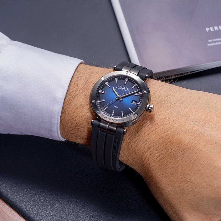 Zegarek Herbelin Newport 12288G15CA to piękny zegarek elegancki idący z duchem żeglarstwa. Herbelin przedstawił model podtrzymany w ciemnej kolorystyce. Okrągła koperta ze stali szlachetnej z czarną powłoką PVD. Na odwrocie koperty znajdziemy srebrny dekiel z wytłoczonym kołem sterowym oraz logo marki Herbelin. Pod szkłem szafirowym niezwykle trudnym do zarysowania znajdziemy słoneczną niebieską tarczę z dużymi czytelnymi wskazówkami oraz indeksami liniowymi. Na godzinie trzeciej znajdziemy specjalne okienko datownika, które wskazuje aktualny dzień miesiąca. Do uszu obudowy przymocowany został gumowy wodoodporny pasek, który zapewni wygodne użytkowanie czasomierza naręcznego. Wygodę w użytkowaniu zapewni również ultra cienka koperta, której grubość wynosi jedyne 10 mm. Herbelin Newport 12288G15CA świetnie zaprezentuje się na każdym męskim nadgarstku.