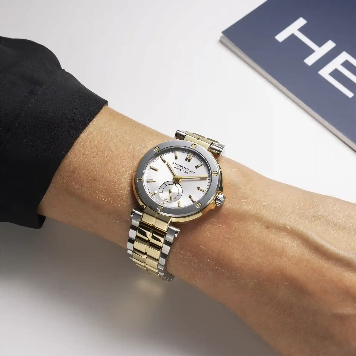 Damski zegarek Herbelin Newport 18289BT1N12 to wyrafinowane połączenie biżuteryjnego blasku i technicznego kunsztu francuskiej manufaktury. Centralnym punktem tego modelu jest srebrzysta tarcza o subtelnym, słonecznym szlifie, która doskonale komponuje się z elementami złoconymi. Zamiast tradycyjnego datownika, na godzinie szóstej umieszczono elegancką subtarczę małej sekundy, co nadaje projektowi lekkości i klasycznej symetrii. Koperta o średnicy 35 mm została zaprojektowana tak, aby podkreślać kobiecy nadgarstek, zachowując jednocześnie charakterystyczny, marynistyczny styl linii Newport.