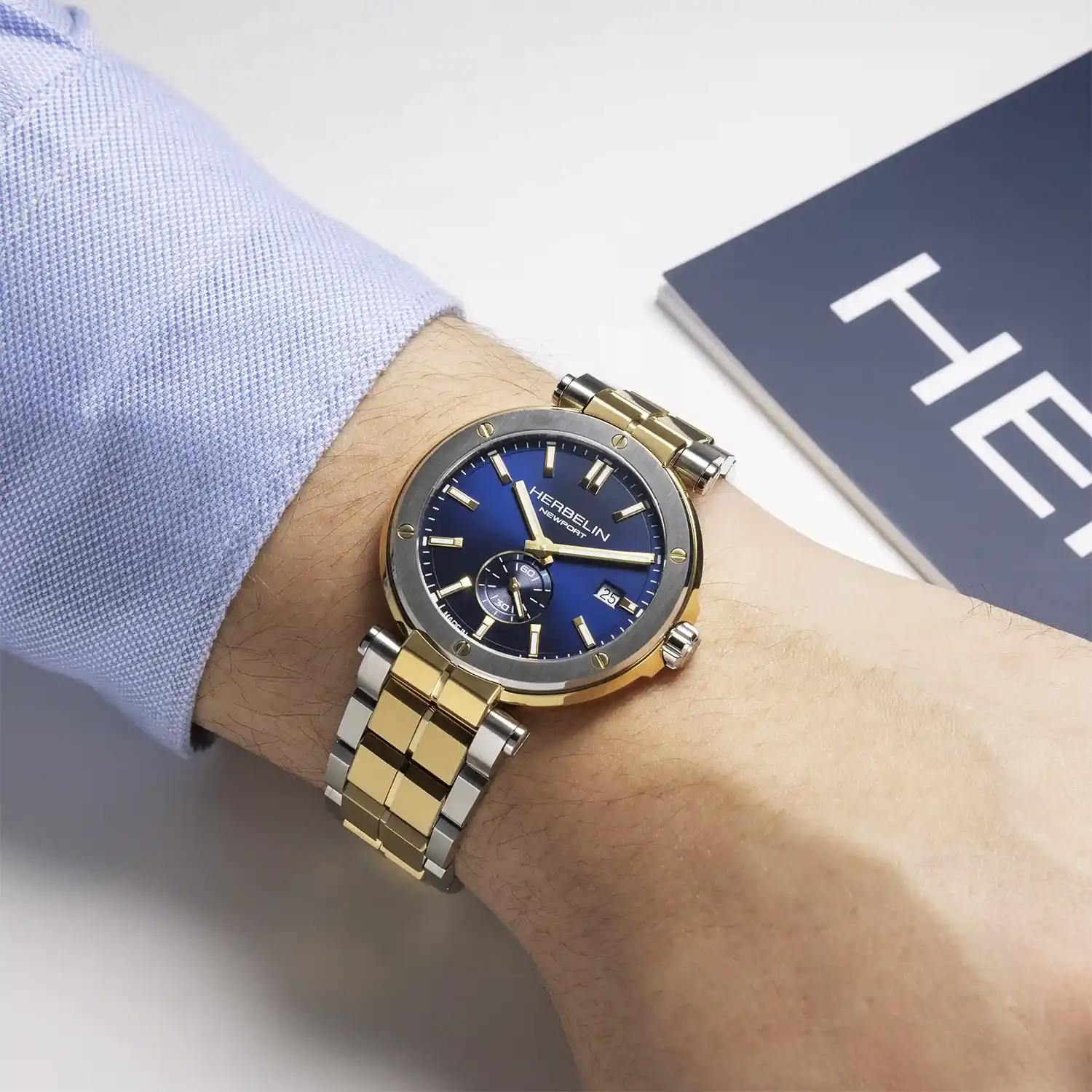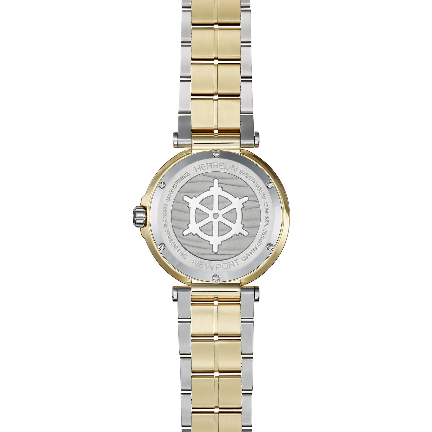Zegarek męski Herbelin Newport 18389BT1N35 to kwintesencja francuskiego stylu, który przenosi estetykę prestiżowych regat wprost na męski nadgarstek. Najbardziej charakterystycznym elementem tej wersji jest solidna, trójrzędowa bransoleta wykonana w technologii bicolore. Połączenie szczotkowanej stali szlachetnej z polerowanymi ogniwami pokrytymi złotem PVD tworzy spójną kompozycję z kopertą, nadając całości biżuteryjnego sznytu. Wyraźne mocowanie bransolety do koperty za pomocą centralnych uszu to znak rozpoznawczy kolekcji Newport, nawiązujący do tradycyjnych mocowań lin na luksusowych jachtach.