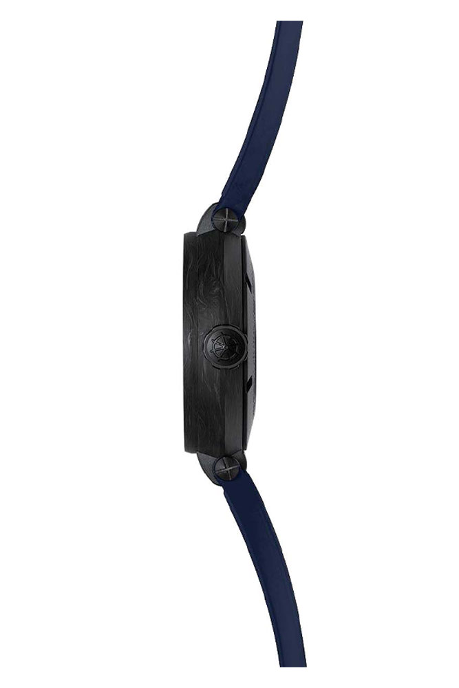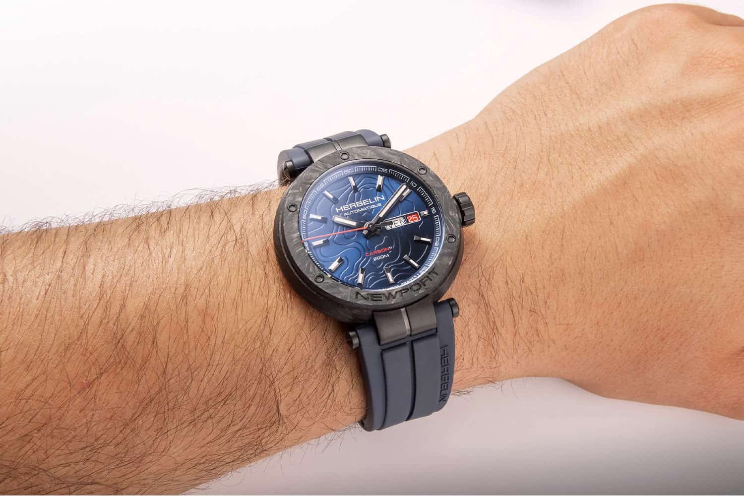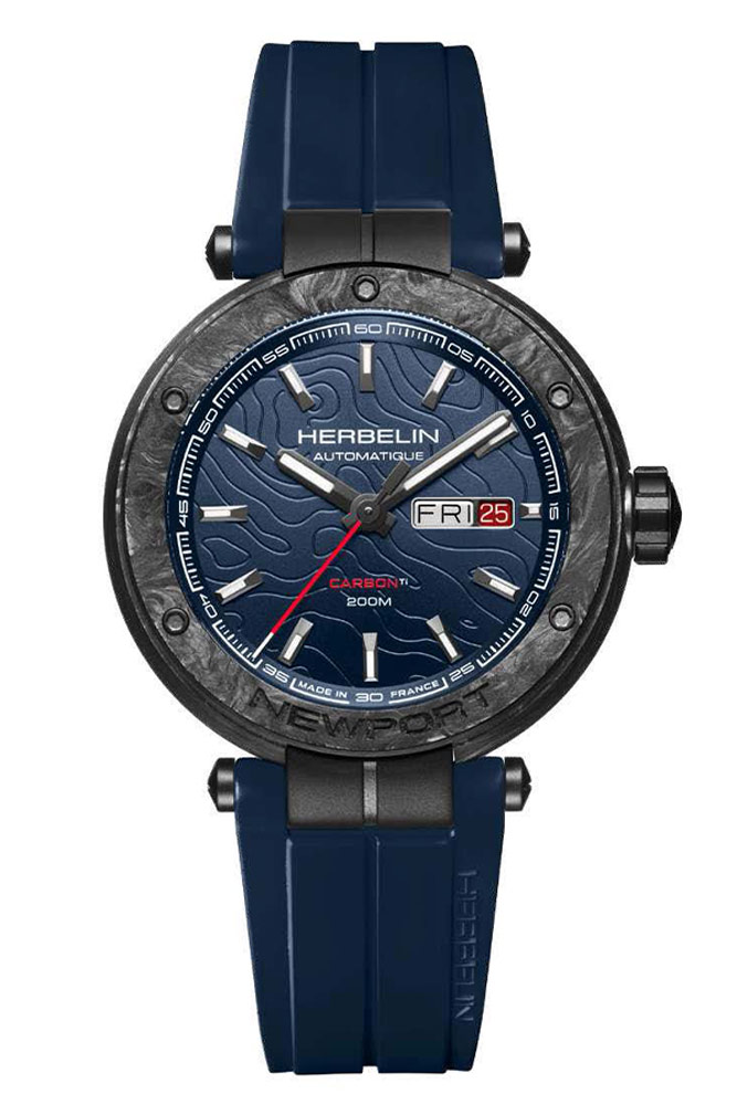 Zegarek męski Herbelin Newport Carbon Titanium Automatic. Francuski czasomierz o numerze referencji 1788CTN15CB to okrągła koperta z karbonu z tytanowymi elementami. Obudowa z karbonu połączona z elementami tytanu zapewni wygodne użytkowanie czasomierza, dzięki swojej lekkości i wysokiej odporności na wodę, ciepło, pot czy korozje. Od frontu obudowy zauważyć można ozdobne śruby i nazwę kolekcji Newport. Do uszu węglowej obudowy przymocowany został niebieski pasek gumowy FKM z tytanową klamerką z powłoką DLC. Pod szkłem szafirowym niezwykle trudnym do zarysowania znajduje się piękna giloszowana na morski wzór niebieska tarcza. Znajdziemy na niej indeksy liniowe, duże czytelne czarne wskazówki z masą luminescencyjną oraz wyróżniającą się czerwoną wskazówkę. Na tarczy znajdziemy również rozbudowany datownik z dniem tygodnia, oraz miesiąca na godzinie trzeciej.