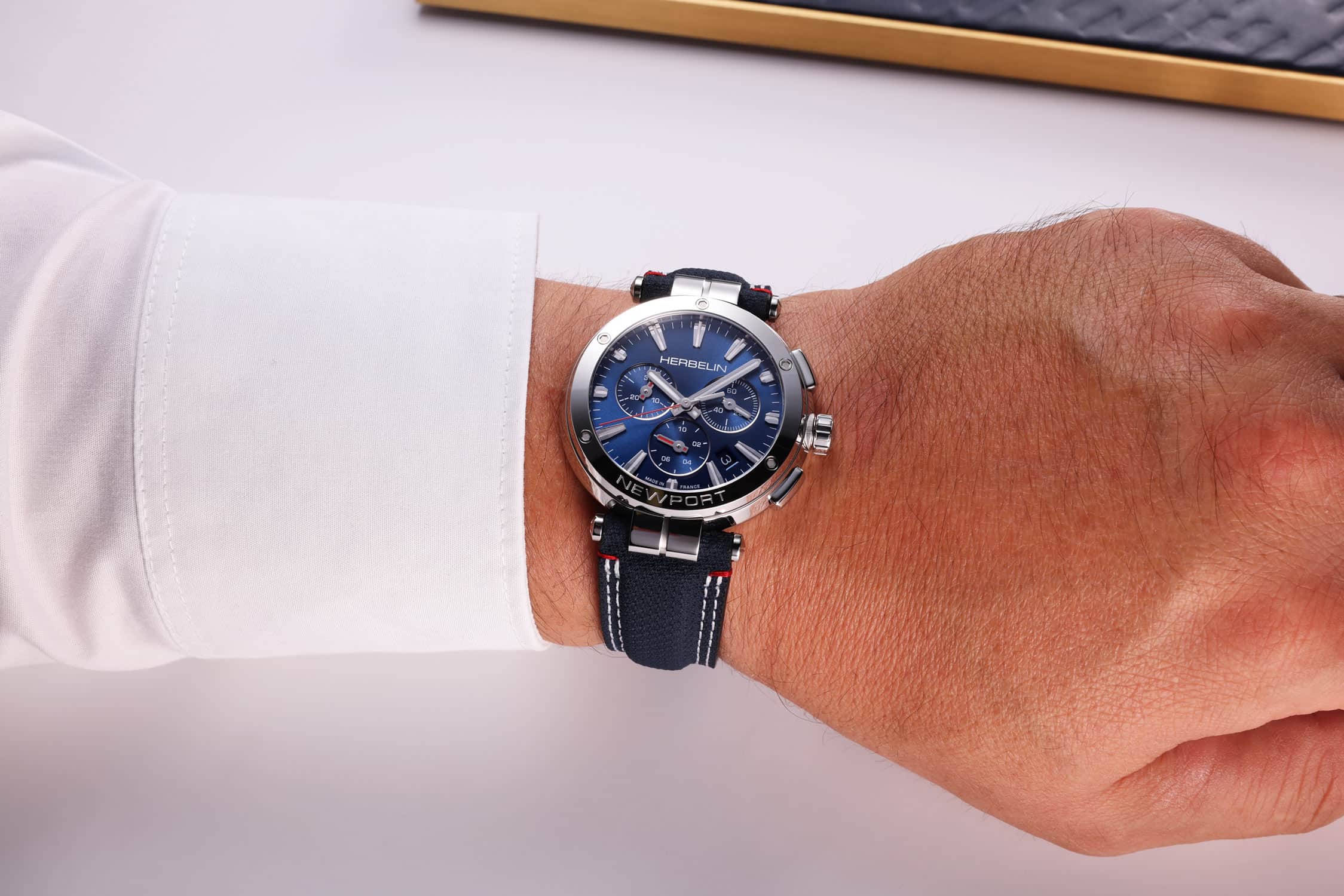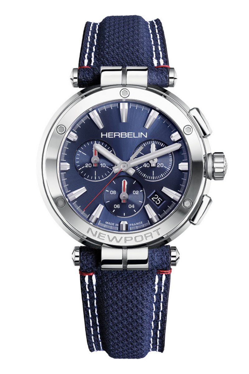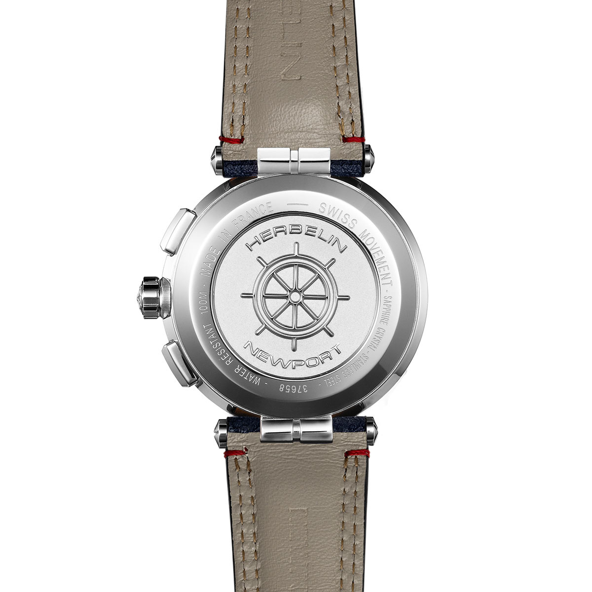 Okrągła koperta w rozmiarze 40.50 mm zbudowana jest ze stali szlachetnej. Rewers to stalowy dekiel ozdobiony wytłoczonym kołem sterowym — symbolem kolekcji Newport. Obudowa posiada klasę szczelności do 100 metrów — z zegarkiem Herbelin można pływać. Jego wyrazista, stalowa koperta harmonijnie zestawiona z granatowym, wysokiej jakości paskiem materiałowym. Zapewnia on nie tylko trwałość, ale również komfort noszenia, nawet w najbardziej wymagających warunkach.