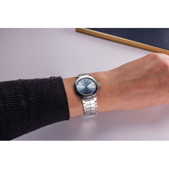 Koperta o średnicy 32 mm i grubości zaledwie 5.85 mm to kwintesencja komfortu i subtelności – wykonana ze stali szlachetnej, harmonijnie połączona z delikatną, ale solidną bransoletą. Zabezpieczenie w postaci szkła szafirowego zapewnia odporność na zarysowania i długotrwałą przejrzystość. Wewnątrz pracuje precyzyjny szwajcarski mechanizm Ronda – niezawodny i bezobsługowy, idealny na co dzień.