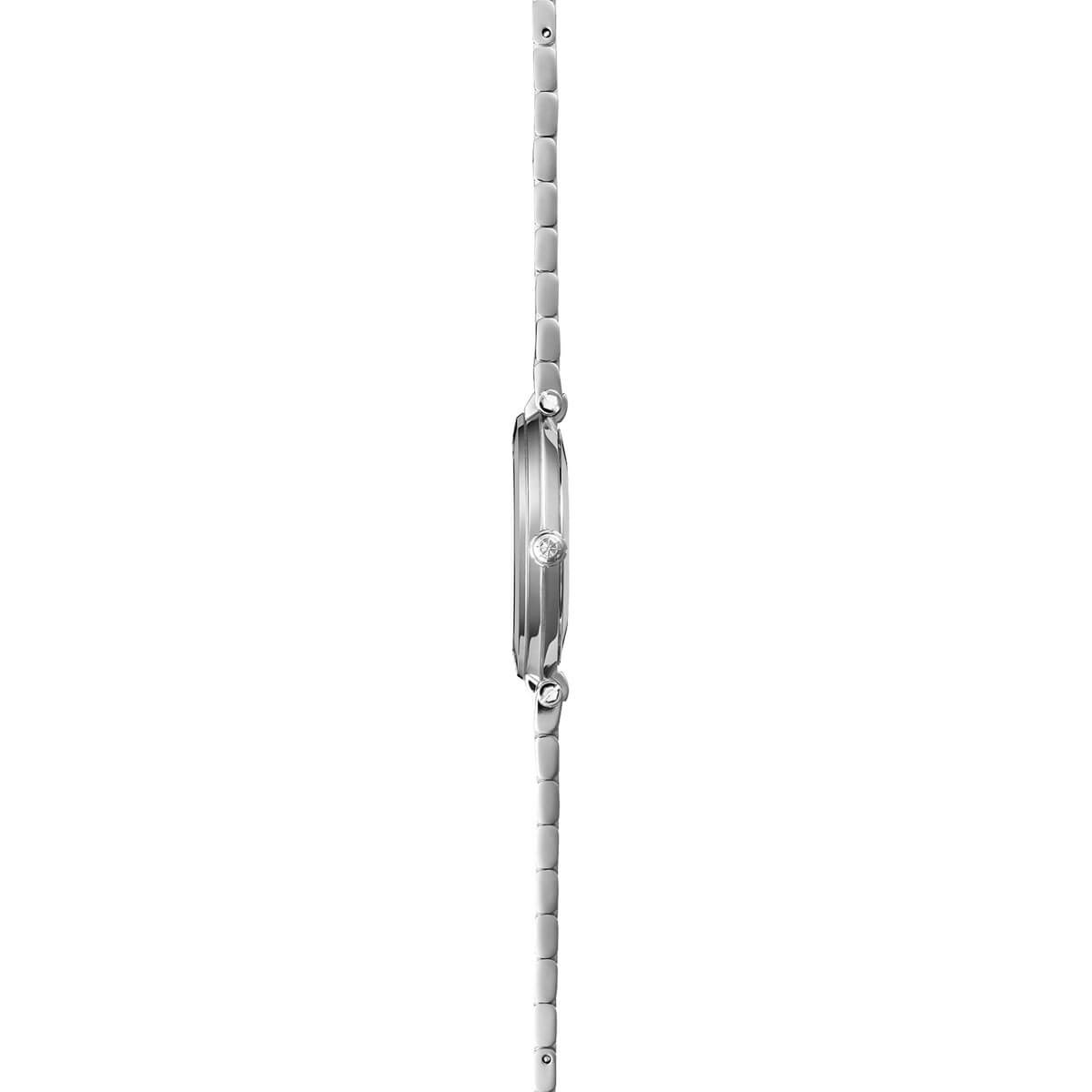 Koperta o średnicy 32 mm i grubości zaledwie 5.85 mm to kwintesencja komfortu i subtelności – wykonana ze stali szlachetnej, harmonijnie połączona z delikatną, ale solidną bransoletą ozdobioną złotymi wstawkami z powłoki PVD. Koronka w tym modelu również pokryta jest złotą powłoką PVD. Zabezpieczenie w postaci szkła szafirowego zapewnia odporność na zarysowania i długotrwałą przejrzystość. Wewnątrz pracuje precyzyjny szwajcarski mechanizm Ronda – niezawodny i bezobsługowy, idealny na co dzień.