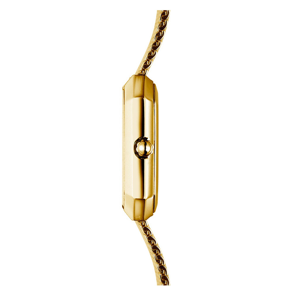 Francuska marka Herbelin przedstawia piękny biżuteryjny zegarek damski z kolekcji Octogone. Kwadratowa koperta wykonana ze stali szlachetnej w kolorze złotym z powłoką PVD. Do obudowy przymocowana została delikatna bransoletka typu MESH. Bransoletki MESH chwalą się niską wagą i łatwą regulacją przy zapięciu. Szkło szafirowe o wysokiej odporności na zarysowania chroni jasną perłową tarczę. Na tarczy znajdziemy sztyletowe wskazówki pozłacane, oraz delikatne punkty na pełnych godzinach. Smaczkiem jest dodanie kamieni cyrkonu na godzinie dwunastej oraz szóstej. Pod perłową tarczą ukrywa się serce czasomierza. Ronda 751 to mechanizm szwajcarski zasilany baterią. Jest to bardzo popularne rozwiązanie, które zapewnia bardzo dobrą pracę zegarkowi przez długi okres użytkowania. Wodoszczelność zegarka oceniona na 3 atmosfery pozwala na niewielkie zachlapania.