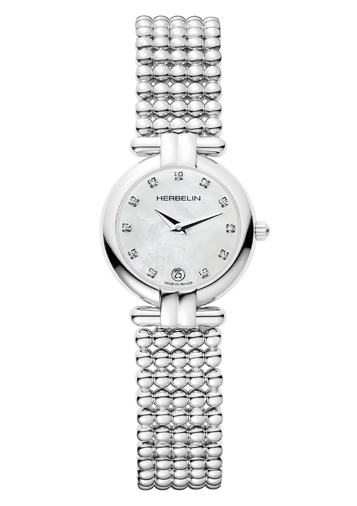 Biżuteryjny i elegancki zegarek damski francuskiej marki Herbelin z kolekcji Perles o numerze referencji 16873B59. Okrągła srebrna koperta ze stali szlachetnej. Niecodziennie spotykana bransoleta w postaci połączonych stalowych kulek o wyglądzie perły w kolorze srebrnym. Tarcza z masy perłowej, na której znajdziemy cyrkonie w punktach godzinowych oraz datownik z dniem miesiąca na godzinie szóstej. Czasomierz Herbelin 16873B59 z kolekcji Perles to delikatny model dziewczęcy z biżuteryjną bransoletką oraz dodatkiem w postaci kamieni cyrkonu na jasnej tarczy. Zegarek z pewnością wyróżni się na każdym kobiecym nadgarstku. Delikatna bransoletka umili użytkowanie czasomierza. Zegarek swoim wyglądem wyróżni się na tle innych klasycznych czasomierzy.