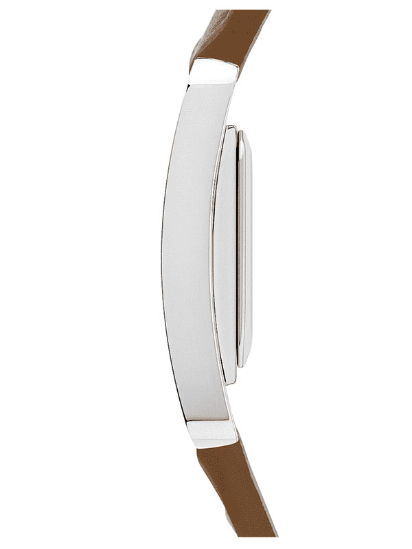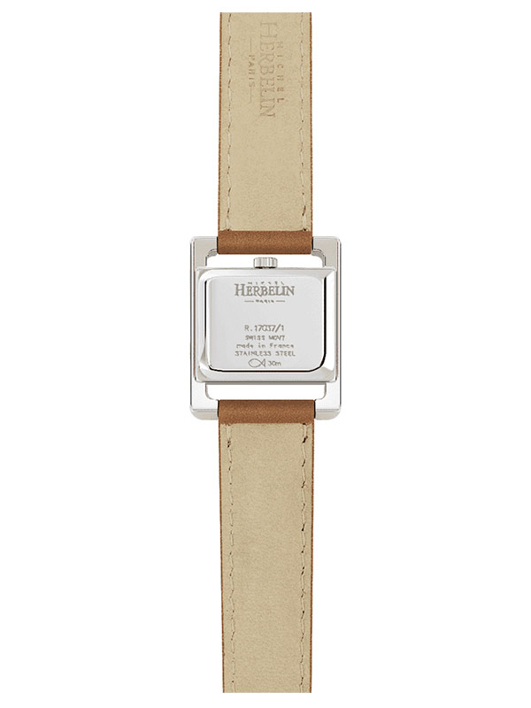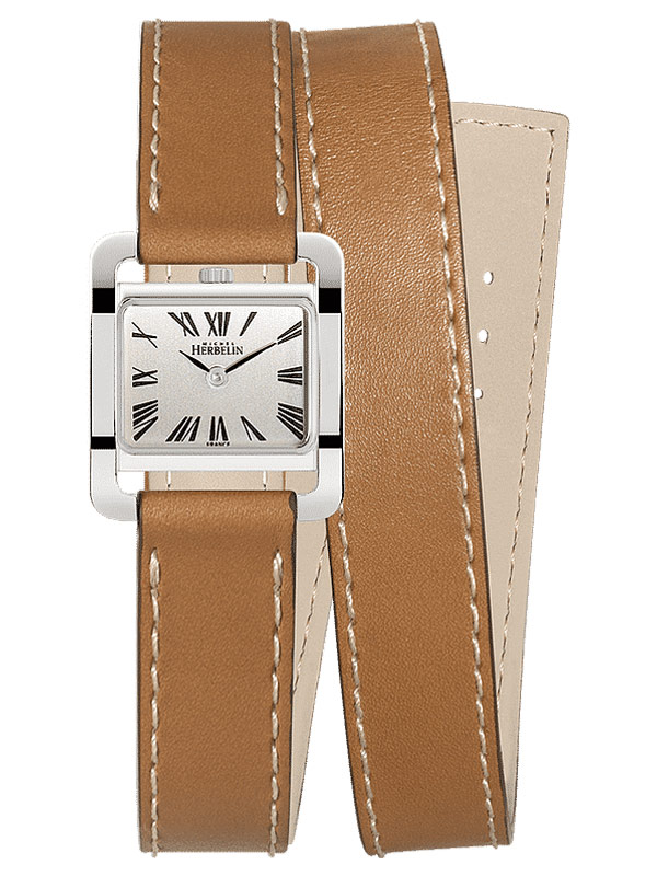 Klasyczny zegarek damski Herbelin V Avenue 17037AP01GDL. Prostokątna koperta wykonana ze stali szlachetnej z koronką w górnej części koperty. Brązowy pasek ze skóry naturalnej, który podwójnie oplata nadgarstek z białymi przeszyciami i zapięciem na sprzączkę. Pasek w takim stylu idealnie odzwierciedla panujące trendy i jest zauważalny na nadgarstku. Srebrna tarcza analogowa z cyframi rzymskimi przykryta jest szkłem szafirowym.
