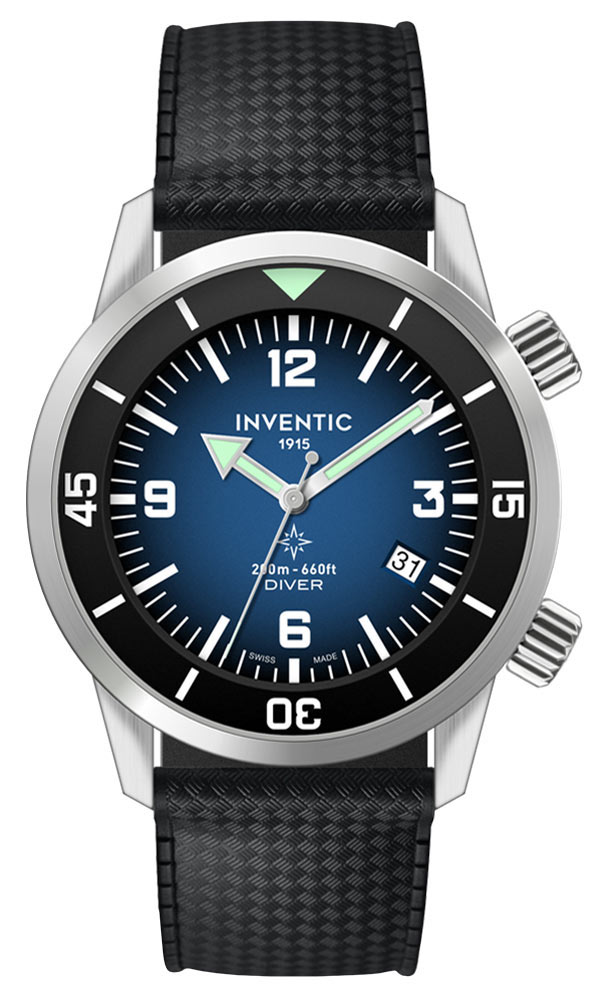 Na ciemnoniebieskiej tarczy o matowym wykończeniu z efektem gradientu są obecne podświetlane za pomocą wypełnienia luminescencyjnego indeksy, cyfry oraz sportowe wskazówki. Datownik znajduje się w asymetrycznym ułożeniu na godzinie czwartej. Czarny pasek hybrydowy z silikonu harmonizuje z czarnym obracającym się pierścieniem na krawędzi tarczy. Tarcza zegarka typu kompresor Inventic jest niezwykle czytelna zarówno za sprawą połączenia indeksów arabskich i liniowych, jak i warstwy luminescencyjnej, którą zostały pokryte wraz ze wskazaniami. Inną cechę szczególną tego czasomierza stanowi rodzaj szklanej pokrywy tarczy. Jest nią wyjątkowo praktyczne szkło mineralne typu K1. Szkło to pełni funkcję alternatywnego, optymalnego rozwiązania kwestii najlepszego zabezpieczenia tarczy zegarka naręcznego na co dzień. Jego specyfika łączy najważniejsze zalety szkła mineralnego i szkła szafirowego jednocześnie nie dziedzicząc ich niedoskonałości. W efekcie szkło mineralne K1 jest imponująco odporne na zarysowania, a przy tym wysoce odporne na stłuczenie.