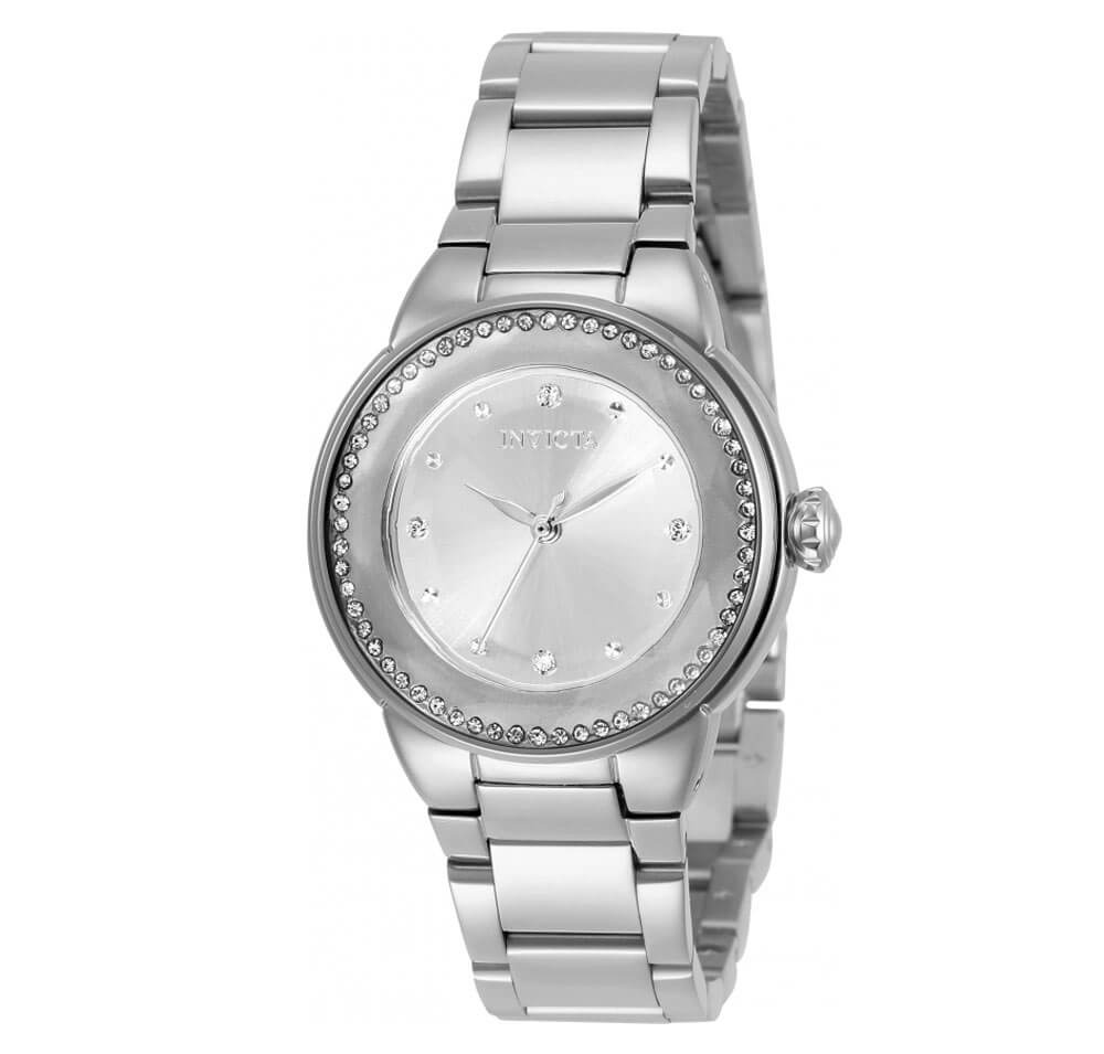 Stylowy damski zegarek Invicta Angel łączy elegancję z nowoczesnym blaskiem dzięki kopercie ozdobionej kryształkami i srebrnej bransolecie ze stali. To modny dodatek o średnicy 34 mm, idealny na co dzień i na wyjątkowe okazje.