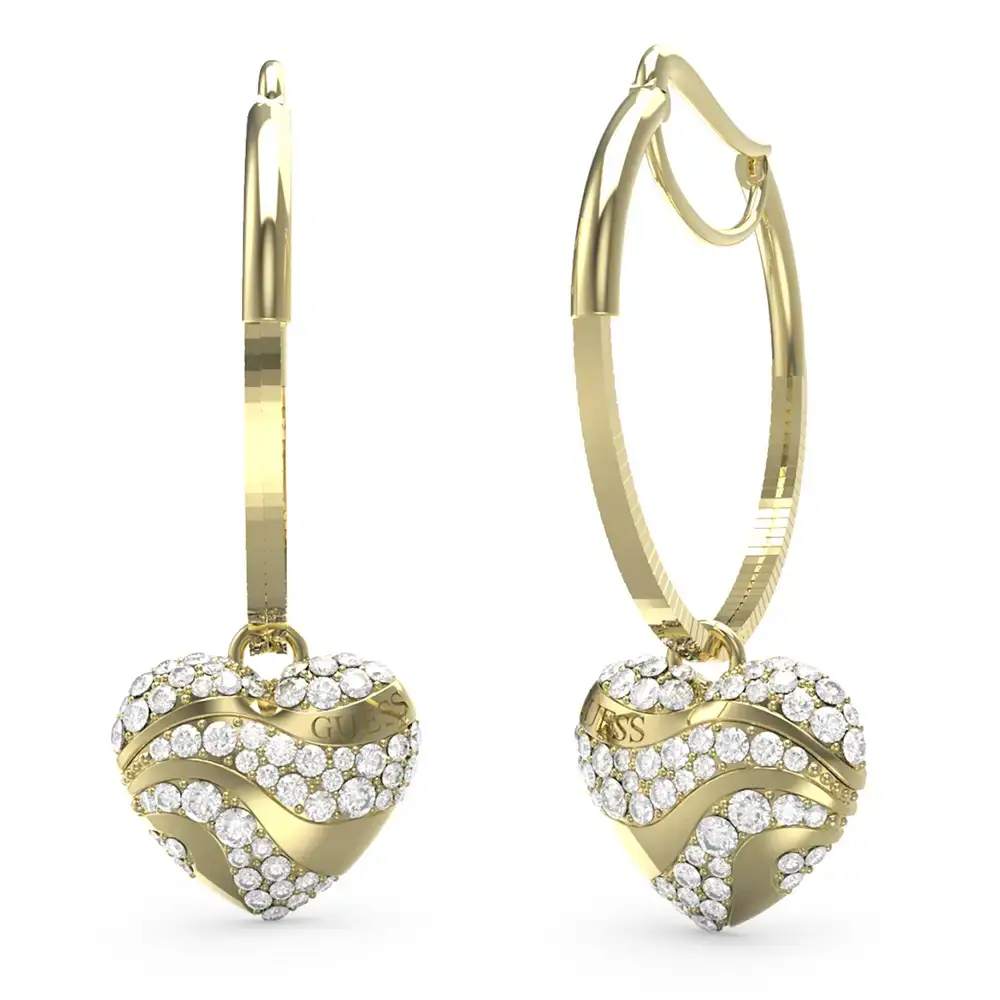 Pozłacane kolczyki koła z wiszącymi sercami GUESS In My Heart JUBE04505JWYGT/U to wyrafinowana propozycja dla kobiet, które cenią biżuterię z duszą – pełną blasku, klasy i romantycznego charakteru.