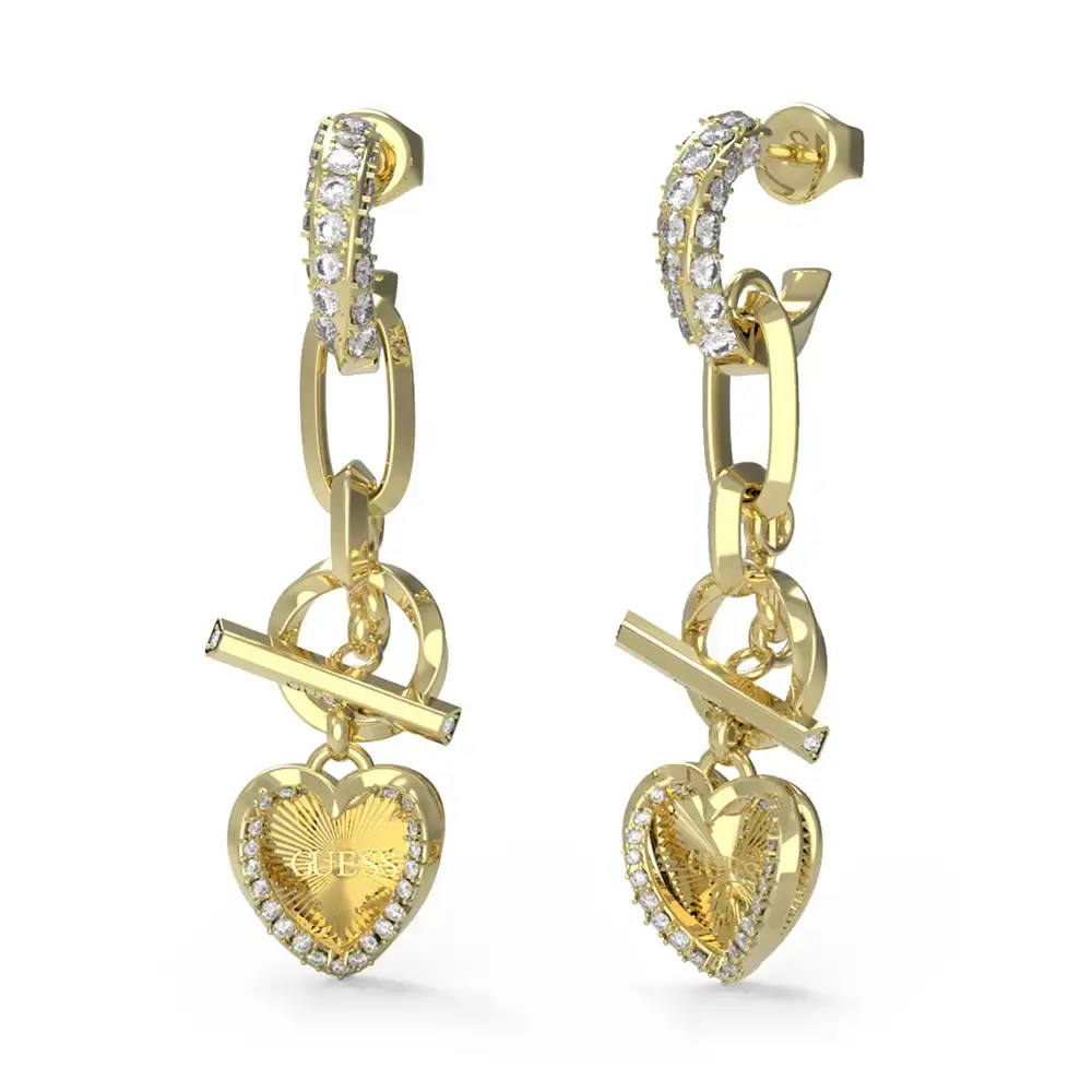 Pozłacane wiszące kolczyki z serduszkami i cyrkoniami GUESS Mon Amour JUBE04600JWYGT/U – biżuteria, która urzeka subtelnym luksusem i wyrafinowaną formą.