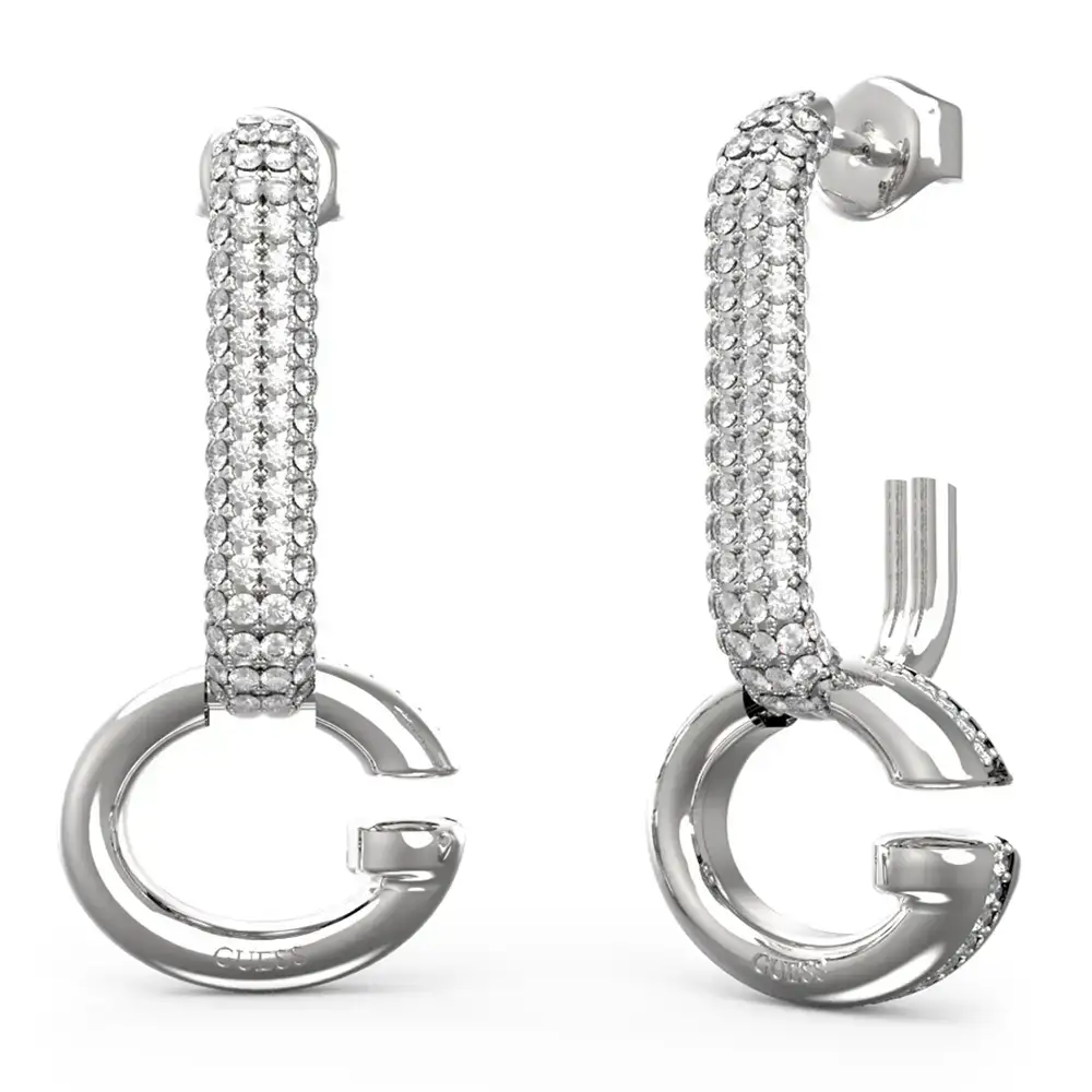 Srebrne wiszące kolczyki z literą G i cyrkoniami Guess Oh My G JUBE04520JWRHT/U to kwintesencja nowoczesnego glamouru i wyrafinowanego stylu. Ich przyciągający wzrok design opiera się na wyrazistej, srebrzystej formie litery „G”, będącej znakiem rozpoznawczym marki Guess, która w tym projekcie zyskuje nową, jubilerską odsłonę.