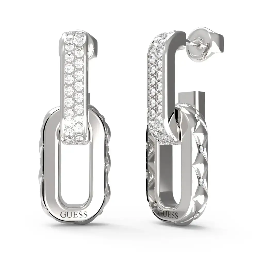 Dolne ogniwo, wykończone na wysoki połysk i ozdobione subtelnym logo GUESS, wyróżnia się efektownym wzorem przypominającym pikowanie, z drobnymi cyrkoniami osadzonymi w jego centralnych punktach. Taki detal nadaje kolczykom wyrafinowaną fakturę i modowy charakter, jednocześnie zachowując balans między luksusem a nowoczesnością. Całość wykonano z trwałej stali chirurgicznej platerowanej rodem, co gwarantuje wysoki połysk, odporność na uszkodzenia i delikatny stosunek nawet do wrażliwej skóry.