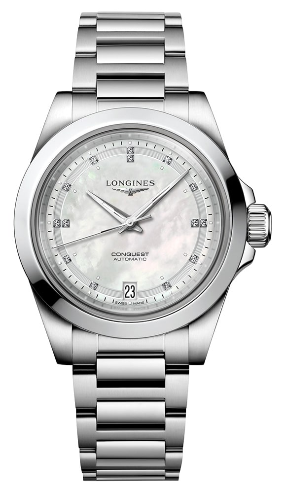 Tarcza została wykonana z naturalnej masy perłowej, która zmysłowo się mieni. Stanowi ona również wyrafinowane podłoże dla 14 diamentów Top Wesselton o łącznej masie 0,035 karata. Zegarek damski Longines Conquest 2023 z diamentami i masą perłową dodatkowo posiada na tarczy wskazówki wypełnione szwajcarską Super-LumiNova® (materiał świetlny). Dokładny i sprawny odczyt minut ułatwia skala kreskowa zorientowana na krawędzi dysku. Pragmatyczną funkcjonalnością jest także minimalistyczny datownik umiejscowiony na godzinie 6. Wysoką postrzeganą wartość zapewnia logo Longines z uskrzydloną klepsydrą, nazwa kolekcji oraz sygnatura szwajcarskiej jakości.