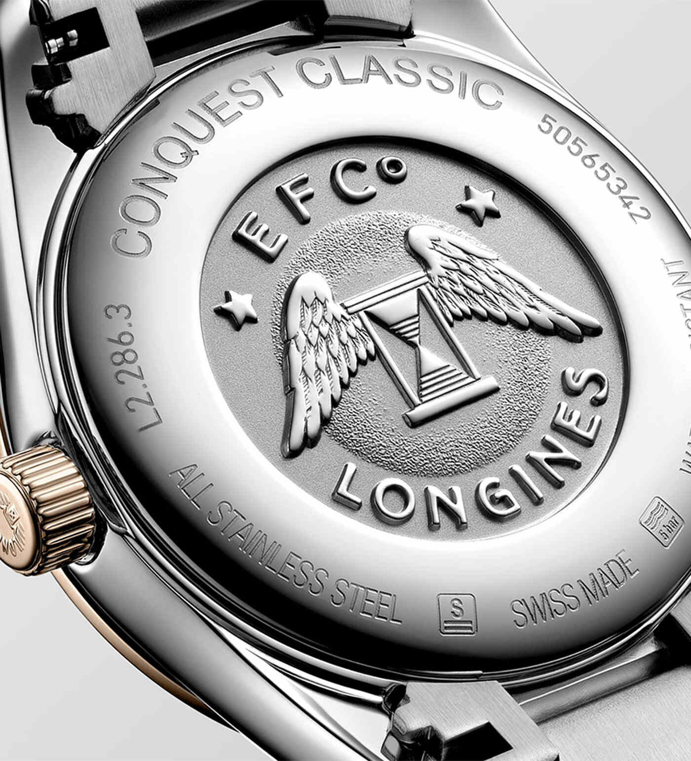 Zegarek damski Longines Conquest Classic Lady L2.286.3.87.7 to kwintesencja sportowej elegancji. Zgodnie z wartościami marki, takimi jak elegancja, tradycja i wydajność powstał czasomierz dla kobiet zawierający te cechy. Okrągła koperta o średnicy 29,50 mm z elementami złoconymi różowym złotem PVD, które znajdują się również na eleganckiej bransoletce. Design zegarka sprawia, że będzie idealnie komponował się ze strojem codziennym, sportowym, jak i z elegancką kreacją. Longines Conquest Classic to uniwersalny czasomierz dla pań na każdą okazję. Odporne na zarysowanie szkło chroni tarczę z masy perłowej z diamentami. Dokładny czas jest odmierzany za pomocą mechanizmu kwarcowego, na baterię z funkcją E.O.L. W momencie, gdy bateria będzie już na wyczerpaniu, wskazówka sekundowa będzie przeskakiwać co 4 sekundy, dając znak, że nadszedł czas na jej wymianę. Wymianę baterii należy zlecić tylko i wyłącznie w autoryzowanym serwisie Longines - Doliński Watch Service.