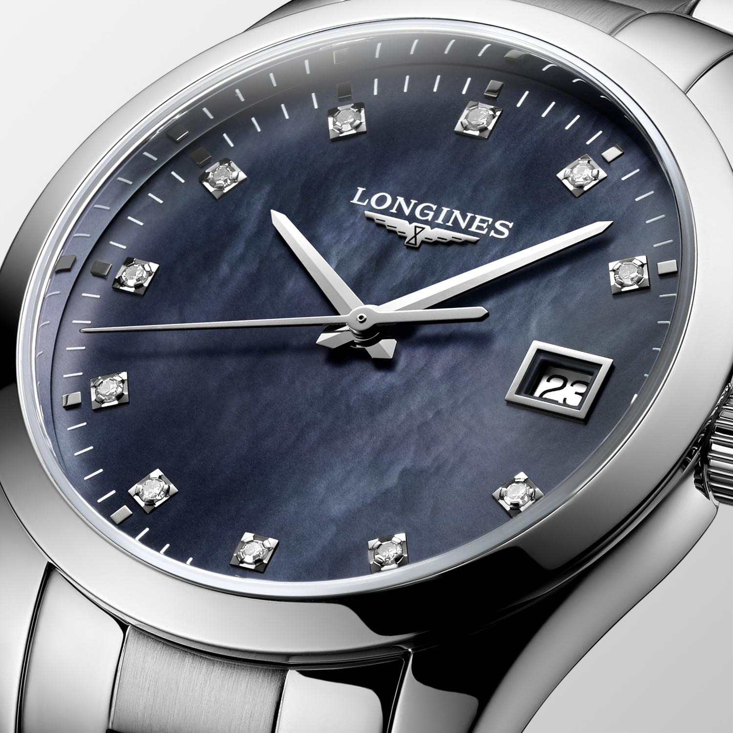Zegarek damski Longines Conquest Classic Lady L2.386.4.88.6 to kwintesencja sportowej elegancji. Zgodnie z wartościami marki, takimi jak elegancja, tradycja i wydajność powstał czasomierz dla kobiet zawierający te cechy. Okrągła koperta o średnicy 34 mm, polerowana na wysoki połysk, ma smukłe i eleganckie uszy koperty, które trzymają bransoletkę z elementami matowymi pośrodku i polerowanymi na brzegach. Design zegarka sprawia, że będzie idealnie komponował się ze strojem codziennym, sportowym, jak i z elegancką kreacją. Longines Conquest Classic to uniwersalny czasomierz na każdą okazję. Odporne na zarysowanie szkło z antyrefleksem chroni tarczę z masy perłowej i dodaje czytelności. 11 diamentów 0,055 karat w miejscu indeksów dodaje niesamowitego blasku. Dokładny czas jest odmierzany za pomocą mechanizmu kwarcowego, na baterię z funkcją E.O.L. W momencie, gdy bateria będzie już na wyczerpaniu, wskazówka sekundowa będzie przeskakiwać co 4 sekundy, dając znak, że nadszedł czas na jej wymianę. Wymianę baterii należy zlecić tylko i wyłącznie w autoryzowanym serwisie Longines - Doliński Watch Service.